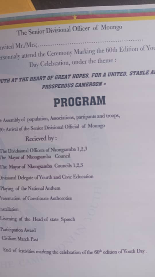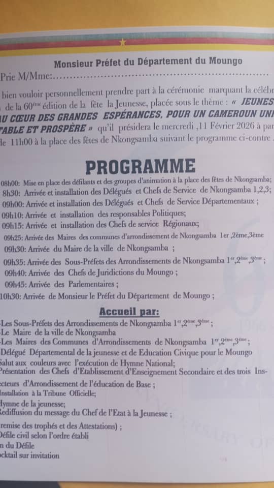 Il faut dire que le Soixantenaire de la Fête de la Jeunesse aura été particulièrement relevé dans le Moungo, avec les mains professionnelles et si expertes du Délégué Départemental de la Jeunesse et de l’Éducation Civique Vincent NGOULA INOPA.