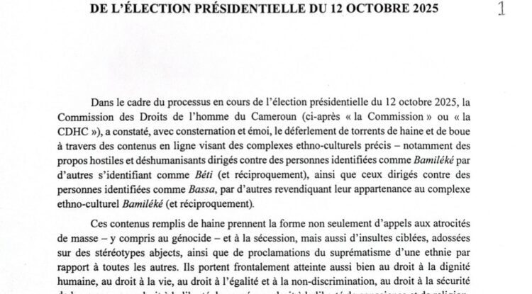 Dans un communiqué tendu public, l’institution dénonce la montée des discours de haine COMMUNIQUE DE et l’incitation à la violence dans les médias sociaux avec des passages à l’acte à l’approche de l’lection du Président de la république, le 12 octobre 2025. Le communiqué de la structure. Source : celcom…