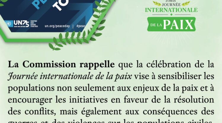 A l’occasion de la célébration de la Journée Internationale de la paix, 21 septembre 2025, sous le thème : « Agissons pour un monde pacifique ». La Commission rappelle que la célébration de la Journée internationale de la paix vise à sensibiliser les populations non seulement aux enjeux de la paix et…