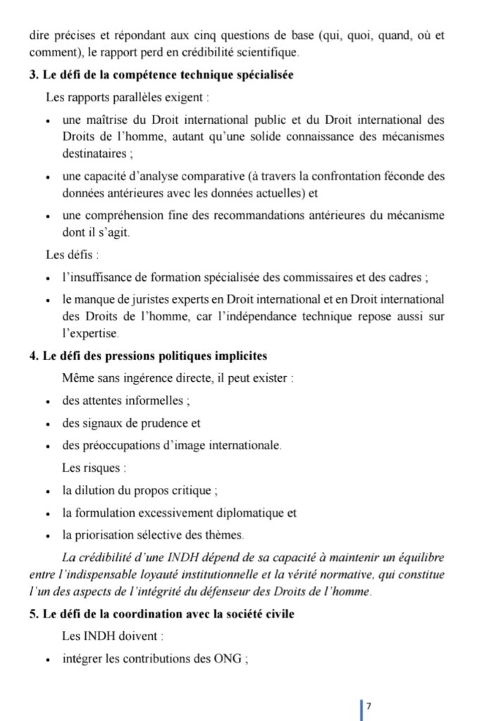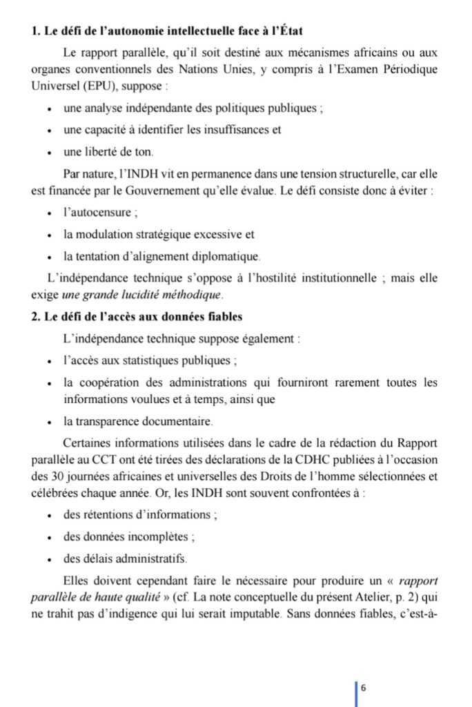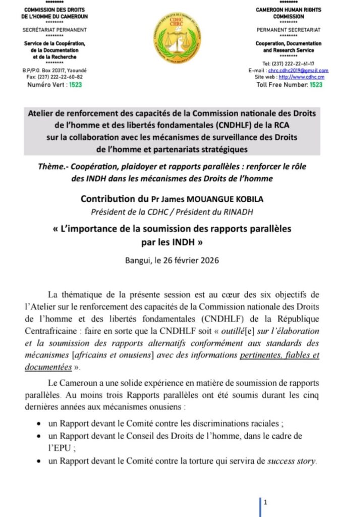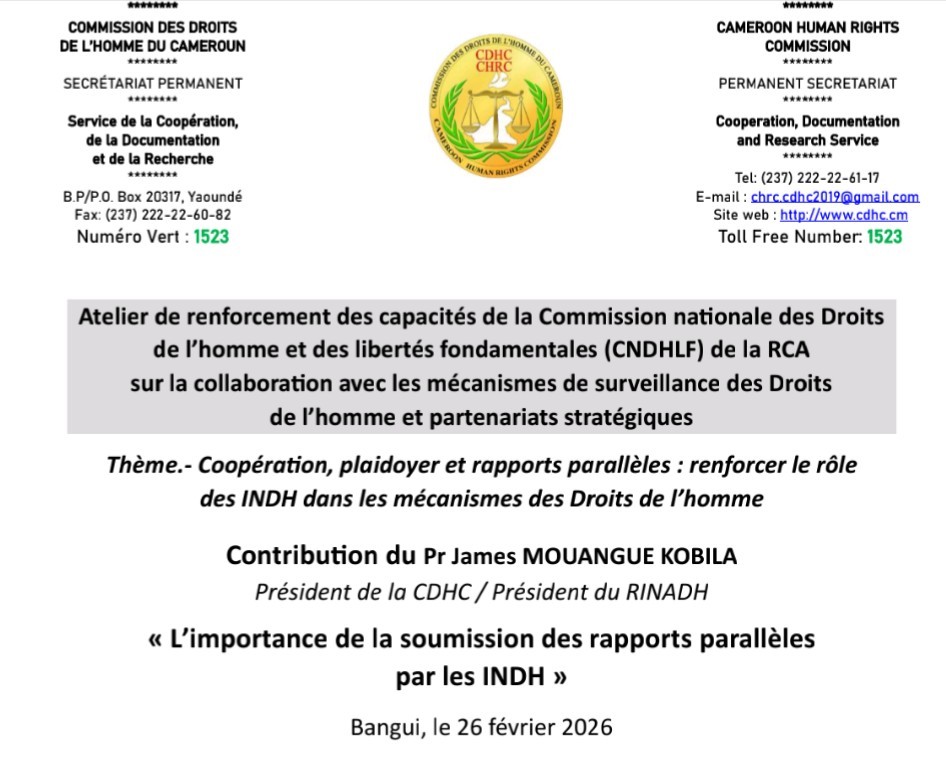 C’était, le 26 février 2026, à l’occasion de l’atelier de renforcement des capacités de la Commission Nationale des Droits de l’Homme et des Libertés Fondamentales (CNDHLF) de la République Centrafricaine (RCA) sur la collaboration avec les mécanismes de surveillance des droits de l’homme et partenariats stratégiques.