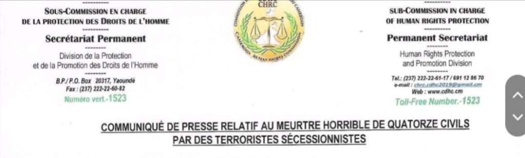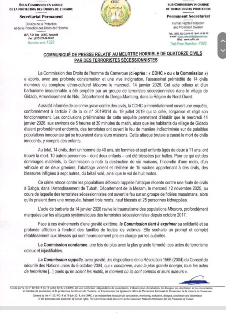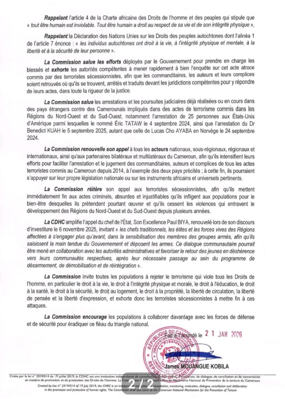 Sociéte 21 janvier 2026 CAMEROUN : COMMUNIQUÉ DE LA CDHC RELATIF AU MEUTRE HORRIBLE DE 14 CIVILS PAR DES TERRORISTES SÉCESSIONNISTES 0 COMMENT 244 Views Print EMail Share On Facebook Tweet On Twitter Share Tweet Share Pin Send Share Une publication de la cellule de communication de la CDHC, le 21 janvier 2026 Publications similaires : Peter Essoka sur la CRTV: « J’ai été condamné parce que j’ai essayé de critiquer le fait qu’il ne faut pas utiliser le discours de haine » Crise Anglophone : Sisiku Ayuk Tabe restera en prison Des élèves du 6 ème appelé à verser une somme de 150F chacun après le vol du téléphone d’un enseignant au lycée de Ngoulmekong Crise anglophone : un séminariste tué dans le Nord-Ouest Previous post Mozambique : l’inondation paralyse, la colère monte Next post Cameroun : le FODECC à l’épreuve des enjeux stratégiques pour 2026 Share Tweet Share Pin Send Share Laisser un commentaire Annuler la réponseVotre adresse e-mail ne sera pas publiée. Les champs obligatoires sont indiqués avec *Commentaire * Nom * E-mail * Site web
