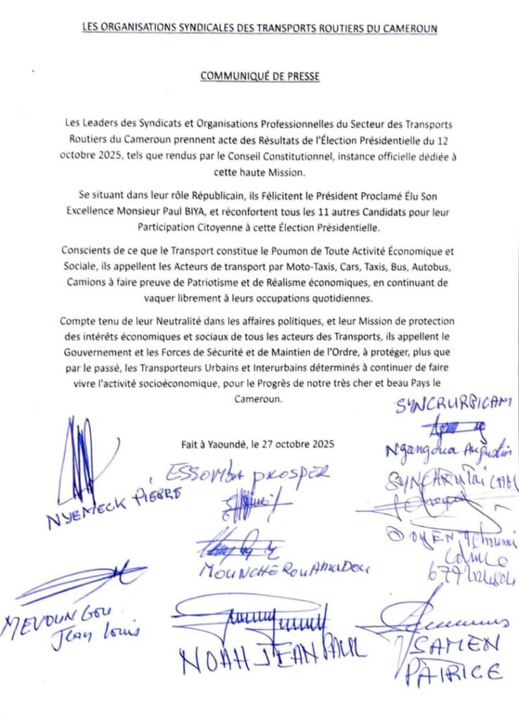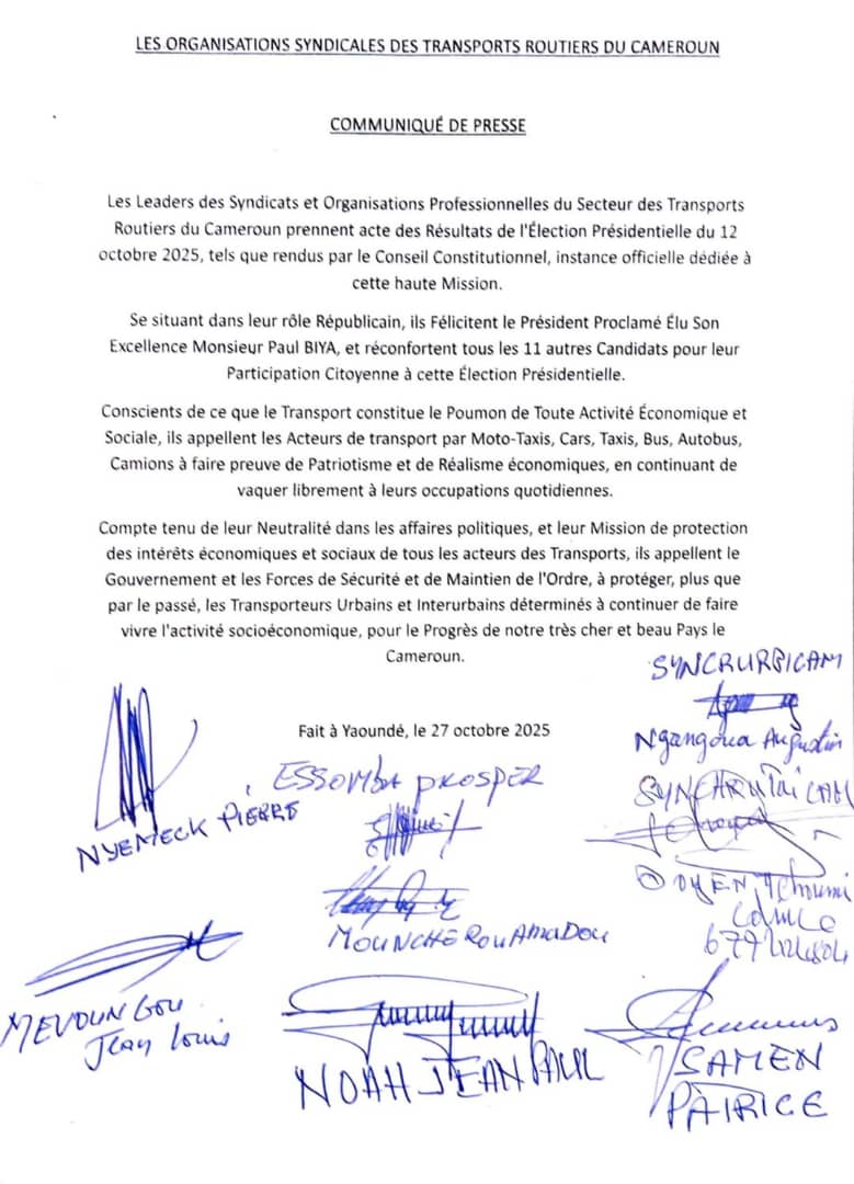 Actualités 28 octobre 2025 Cameroun : communiqué de presse des Organisations Syndicales des Transports Routiers 0 COMMENT 714 Views Print EMail Share On Facebook Tweet On Twitter Share Tweet Share Pin Send Share Il est relatif à la proclamation des résultats de l’élection du Président de la république du Cameroun, le 27 octobre 2025. Source : celcom Publications similaires : Ballon d’or France football : la fin d’une ère CAN 2019 : le gouvernement crie à l’injustice Can 2019 : coup de gueule de Martin Camus Mimb Culture : AYISSI NGA le créateur des vêtements Streets Previous post CAMEROUN : MESSAGE DE FIERTÉ ET d’ENGAGEMENT DES FRANCKISTES Next post CAMEROUN : LES LEADERS SYNDICAUX DU SECTEUR DES TRANSPORTS ROUTIERS FÉLICITENT LE PRÉSIDENT PROCLAMÉ ÉLU S.E. PAUL BIYA Share Tweet Share Pin Send Share Laisser un commentaire Annuler la réponseVotre adresse e-mail ne sera pas publiée. Les champs obligatoires sont indiqués avec *Commentaire * Nom * E-mail * Site web