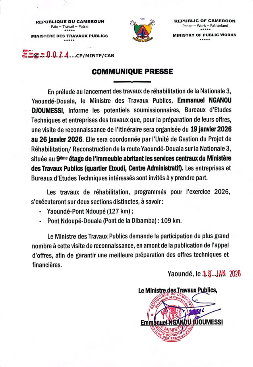 Actualités 19 janvier 2026 Cameroun : communiqué du MINTP 0 COMMENT 1099 Views Print EMail Share On Facebook Tweet On Twitter Share Tweet Share Pin Send Share Source : celcom MINTP Publications similaires : Ballon d’or France football : la fin d’une ère CAN 2019 : le gouvernement crie à l’injustice Can 2019 : coup de gueule de Martin Camus Mimb Culture : AYISSI NGA le créateur des vêtements Streets Previous post CAN 2025 : le Sénégal dompte le football Business Next post CAN 2025 : Claude Le Roy, le « Sorcier » devenu l’ange gardien du football africain Share Tweet Share Pin Send Share Laisser un commentaire Annuler la réponseVotre adresse e-mail ne sera pas publiée. Les champs obligatoires sont indiqués avec *Commentaire * Nom * E-mail * Site web