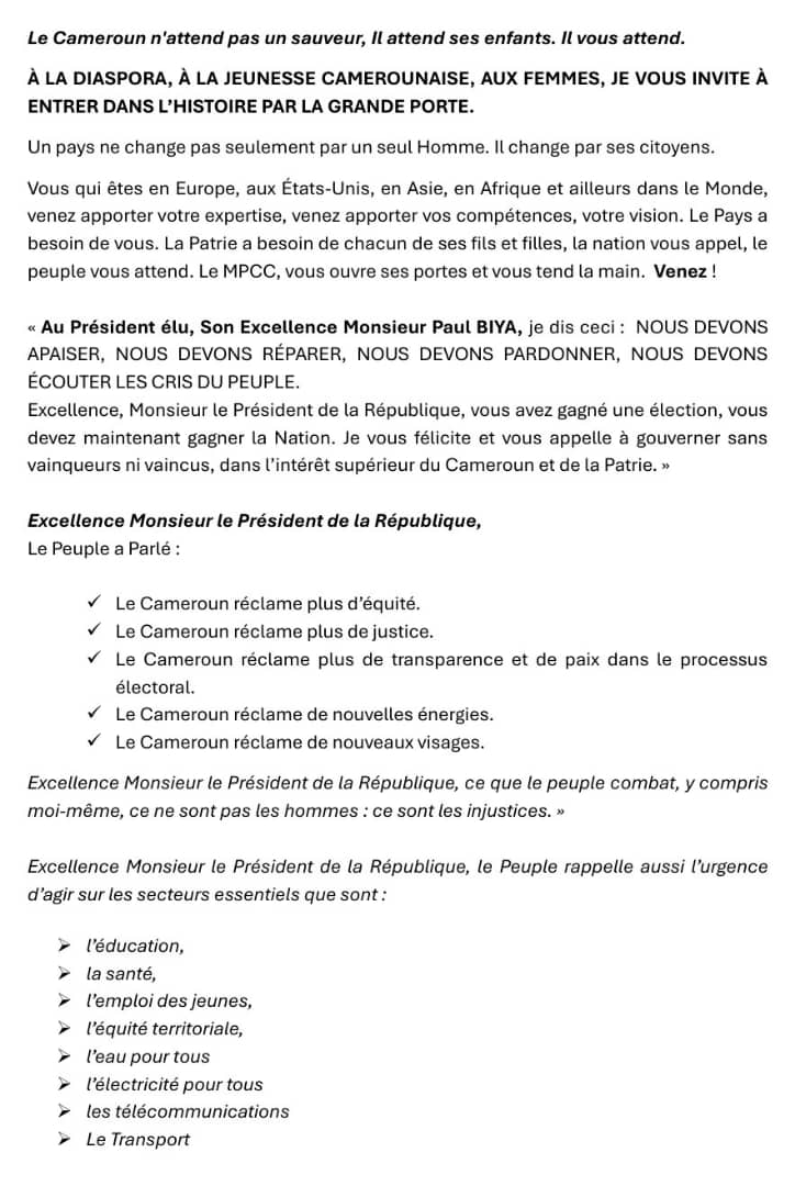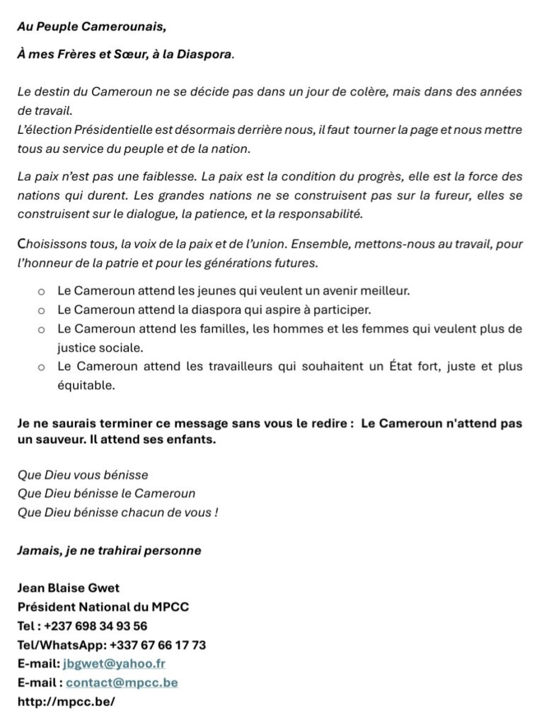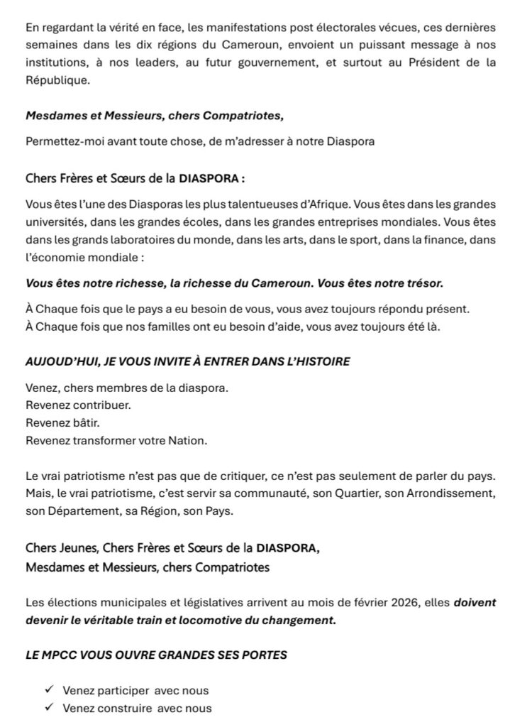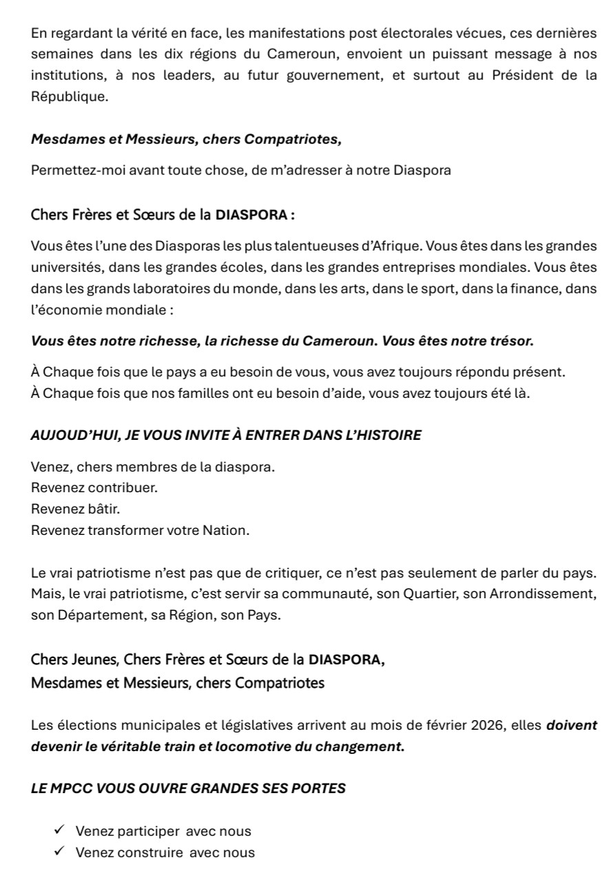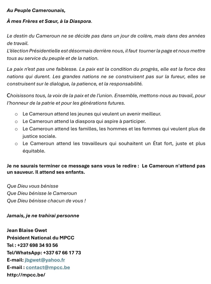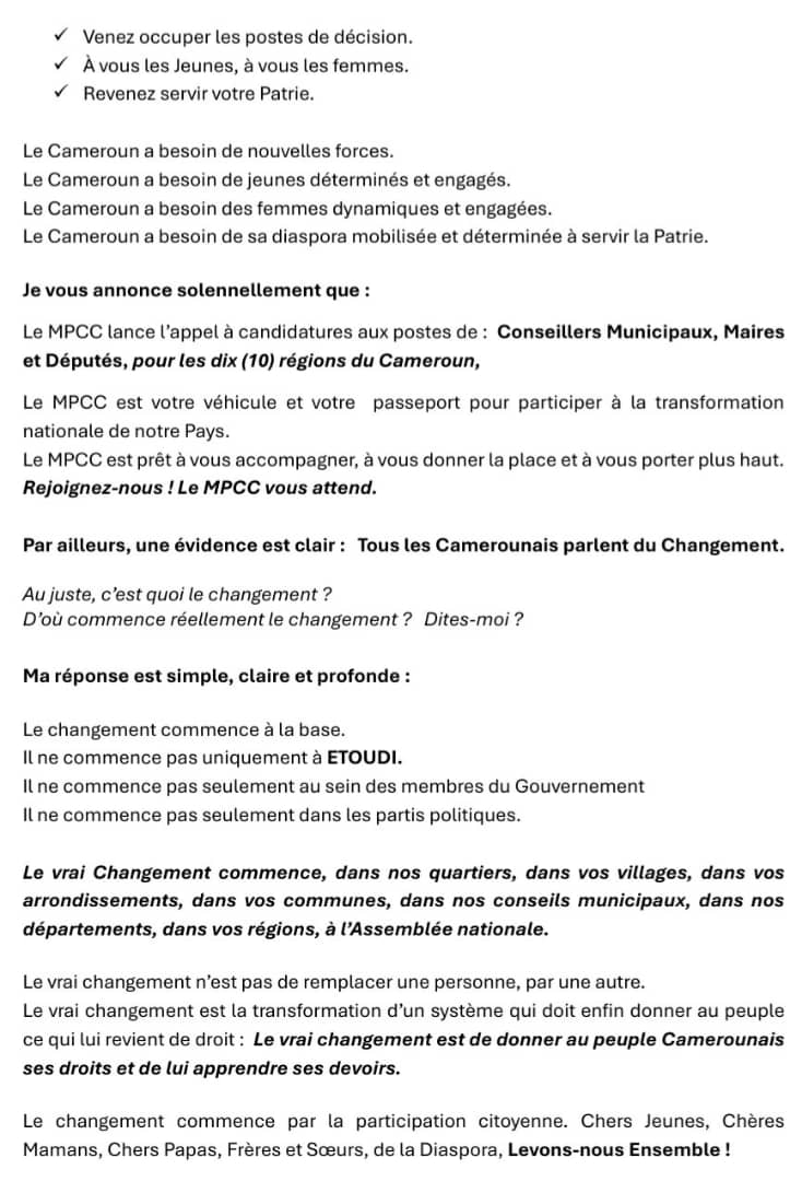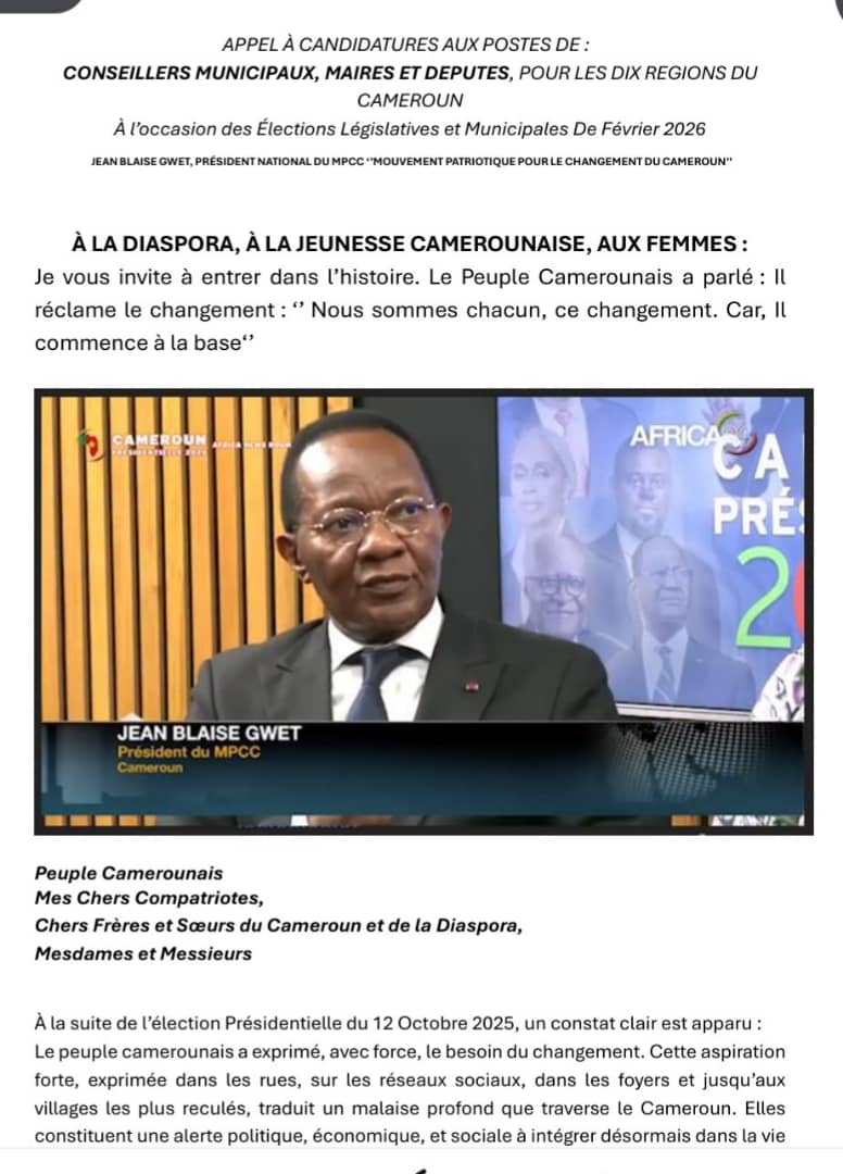 Politique 21 novembre 2025 Cameroun : il lance un appel à candidature à des postes politiques 0 COMMENT 164 Views Print EMail Share On Facebook Tweet On Twitter Share Tweet Share Pin Send Share Ce leader politique s’adresse à la diaspora, à la jeunesse camerounaise et aux femmes. Bertrand TJANI Publications similaires : Le RDPC adopte la stratégie du porte-à-porte pour la pré-campagne électorale dans la région de l’Adamaoua «Ce qui ne va pas, c’est l’inhumanité du régime» selon Cabral Libii Présidentielle 2018 : Maurice Kamto décline son invitation sur vision 4 Présidentielle 2018 : le ministre de l’administration territoriale alloue des fonds aux gouverneurs, préfets et sous-préfets Previous post Sous l’égide du Président de Section RDPC SOGNIA Bertin : MOMBO OUVRE LE BOULEVARD DE LA VICTOIRE AUX RÉGIONALES À JEAN PAUL ÉWANÉ Next post Le Mythe de la biodégradabilité : pourquoi le plastique interdit persiste au Cameroun en 2025 ? Share Tweet Share Pin Send Share Laisser un commentaire Annuler la réponseVotre adresse e-mail ne sera pas publiée. Les champs obligatoires sont indiqués avec *Commentaire * Nom * E-mail * Site web