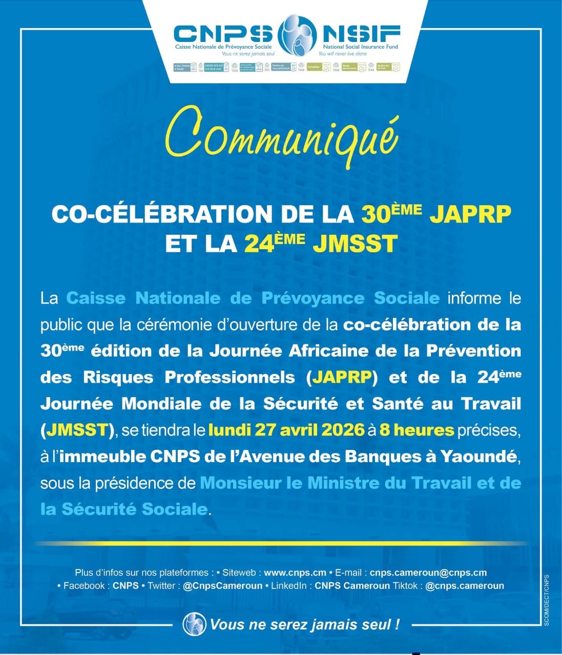 Actualités 23 avril 2026 Cameroun : le communiqué de la CNPS relatif à la co-célébration de la 30e JAPRP et la 24e JMSST 0 COMMENT 70 Views Print EMail Share On Facebook Tweet On Twitter Share Tweet Share Pin Send Share Ce sera sous la présidence du Ministre du Travail et de la Sécurité Sociale, Grégoire Owona. Source : celcom CNPS Publications similaires : Ballon d’or France football : la fin d’une ère CAN 2019 : le gouvernement crie à l’injustice Can 2019 : coup de gueule de Martin Camus Mimb Culture : AYISSI NGA le créateur des vêtements Streets Previous post Reconstruction de la route Ngaoundéré-Garoua : l’entreprise notifiée pour le démarrage des travaux sur la section Kéroua-Pont Salah Next post Nationale N°11 : une concertation au Mintp pour lever les obstacles sur la section Nkambe-Misaje Share Tweet Share Pin Send Share Laisser un commentaire Annuler la réponseVotre adresse e-mail ne sera pas publiée. Les champs obligatoires sont indiqués avec *Commentaire * Nom * E-mail * Site web