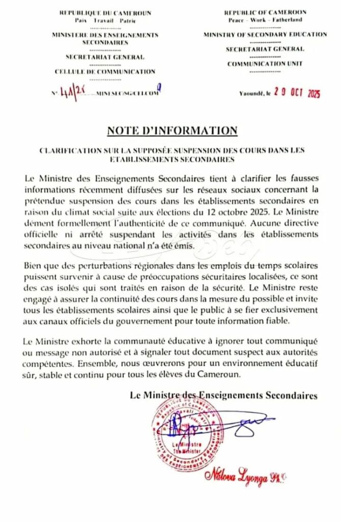 Dans une note d’information signée le Mercredi 29 Octobre 2025, par Pauline Nalova Lyonga, ministre des Enseignements secondaires, démentant formellement toute décision de suspension des cours dans les établissements scolaires. Elle appelle à la vigilance face aux rumeurs circulant sur les réseaux sociaux et rassure que les activités académiques se poursuivent normalement sur l’ensemble du territoire.
