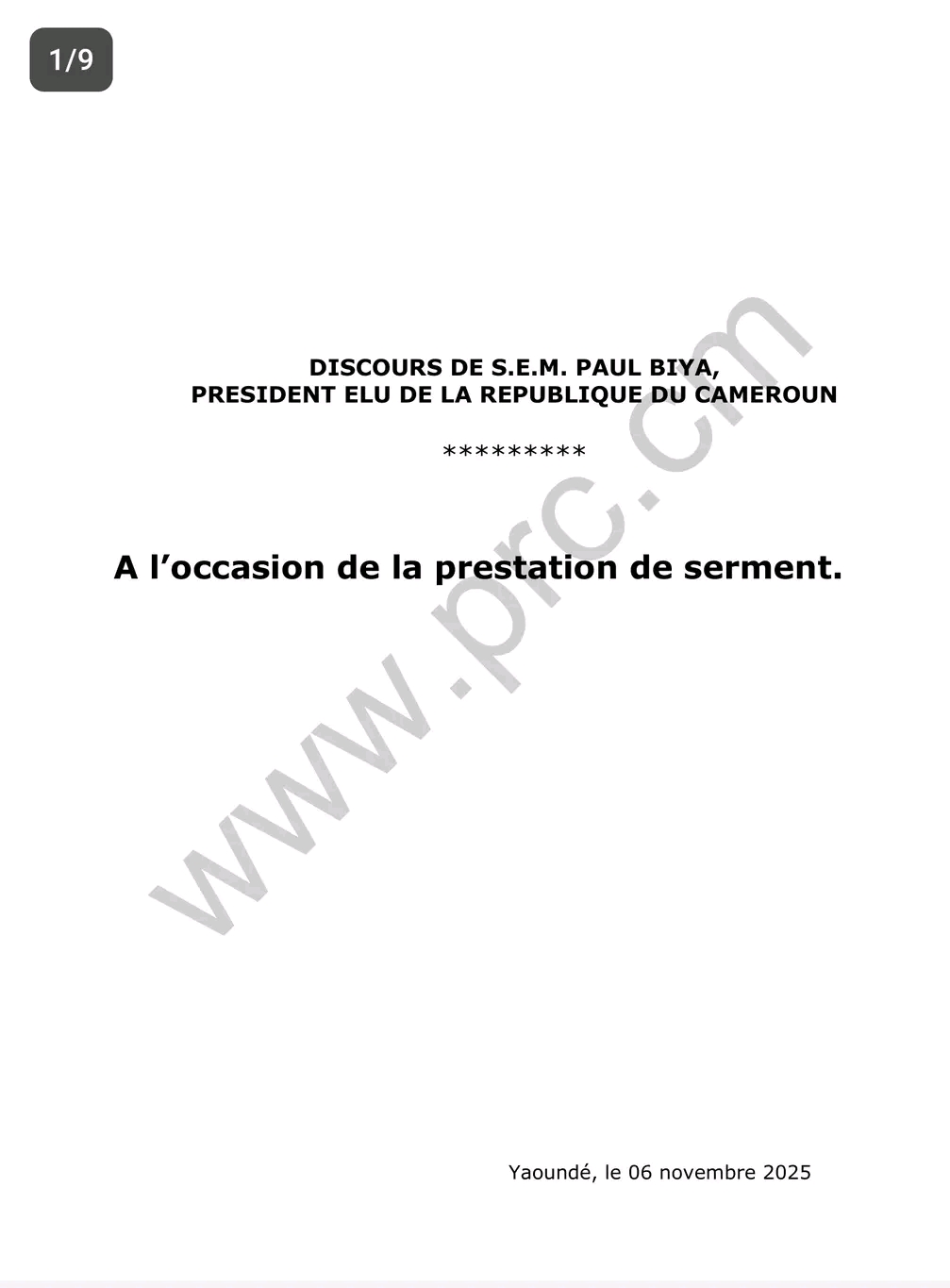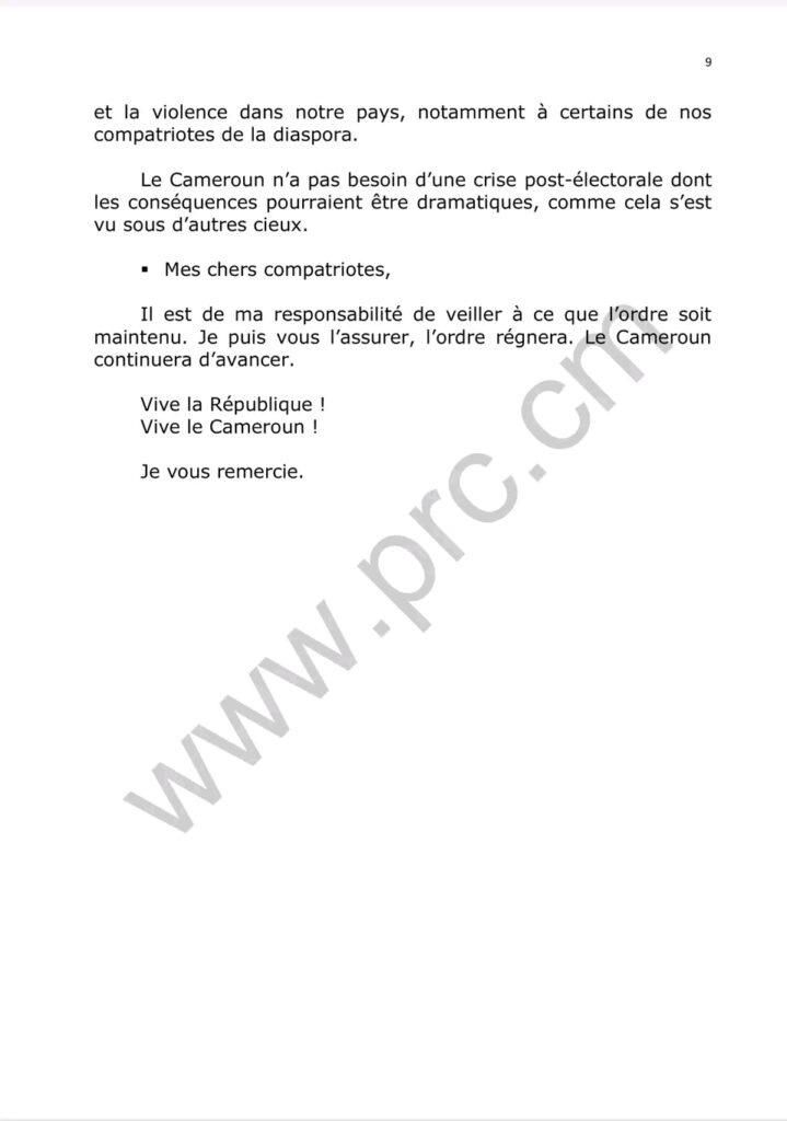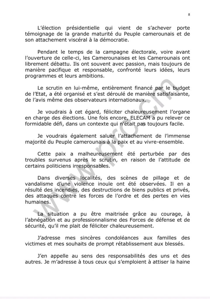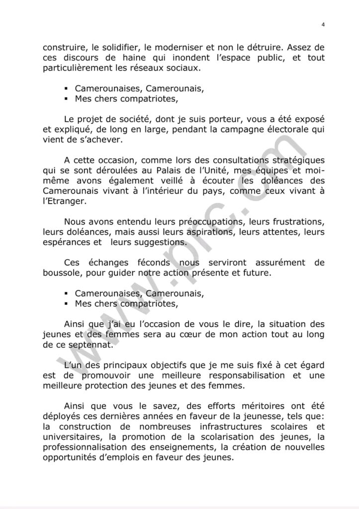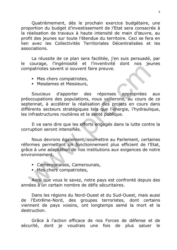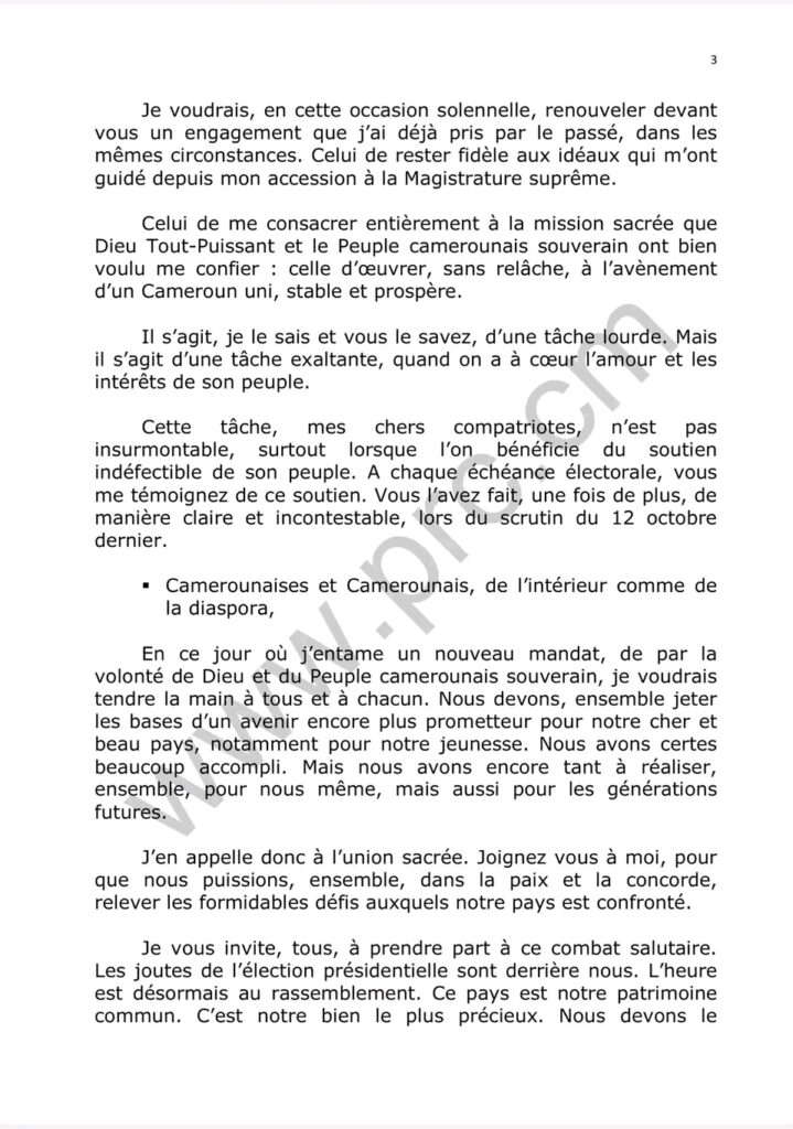 Le discours d’investiture du Chef de l’État ,Son Excellence Paul Biya ,quelques minutes après sa prestation de serment ce 06 novembre 2025.