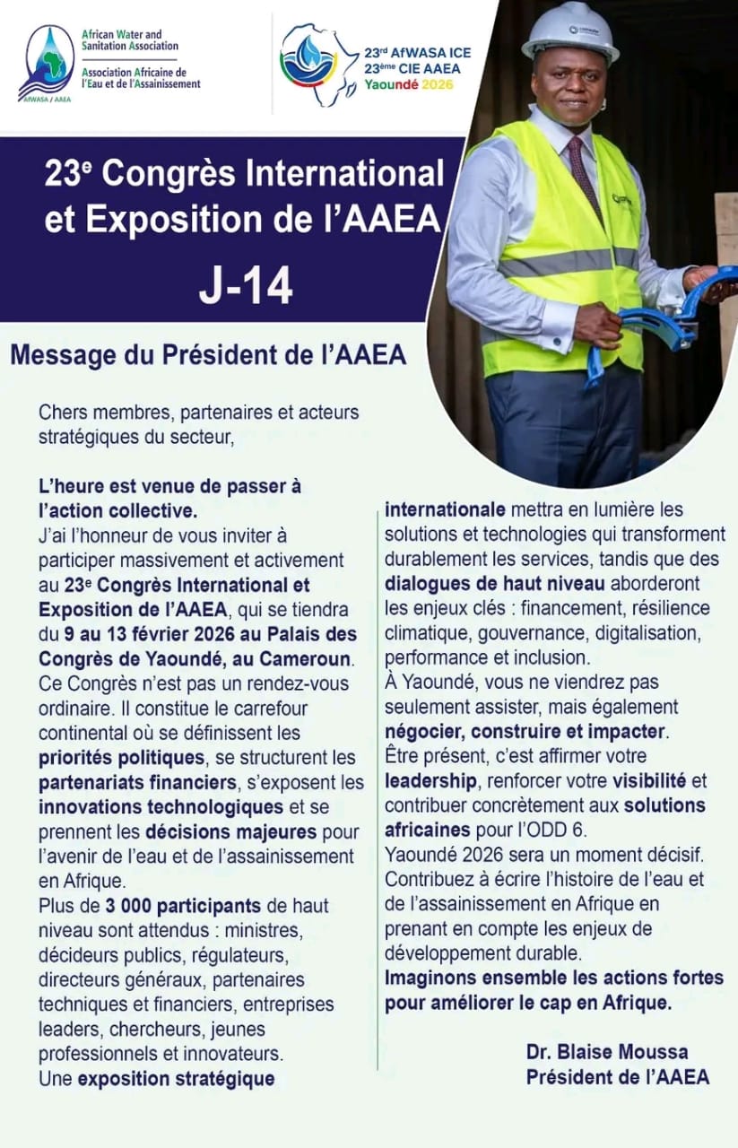 Actualités 2 février 2026 Cameroun : message du Dg de CAMWATER 0 COMMENT 78 Views Print EMail Share On Facebook Tweet On Twitter Share Tweet Share Pin Send Share A l’occasion du 23e Congrès international et exposition de L’Association Africaine de l’Eau et de l’Assainissement. Source : celcom CAMWATER Publications similaires : Ballon d’or France football : la fin d’une ère CAN 2019 : le gouvernement crie à l’injustice Can 2019 : coup de gueule de Martin Camus Mimb Culture : AYISSI NGA le créateur des vêtements Streets Previous post CAMWATER : le Dr Blaise Moussa fait le tour d’horizon de l’actualité de l’entreprise Next post CAMWATER : en 2026, l’eau fait un pas de plus vers vous ! Share Tweet Share Pin Send Share Laisser un commentaire Annuler la réponseVotre adresse e-mail ne sera pas publiée. Les champs obligatoires sont indiqués avec *Commentaire * Nom * E-mail * Site web