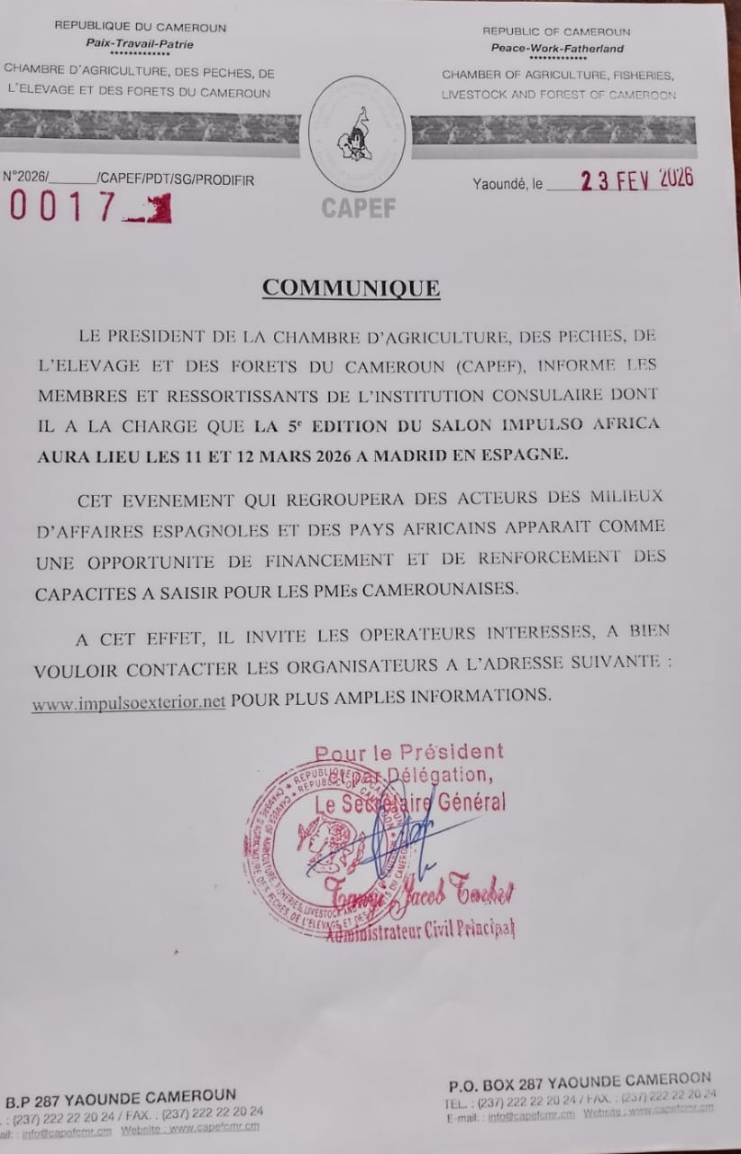 Actualités 24 février 2026 Cameroun : un communiqué de la CAPEF relatif à un salon international prévu en Espagne 0 COMMENT 109 Views Print EMail Share On Facebook Tweet On Twitter Share Tweet Share Pin Send Share Source : celcom CAPEF Publications similaires : Ballon d’or France football : la fin d’une ère CAN 2019 : le gouvernement crie à l’injustice Can 2019 : coup de gueule de Martin Camus Mimb Culture : AYISSI NGA le créateur des vêtements Streets Previous post CAPEF/MACFRUT 2026 : un point de presse relatif aux préparatifs de la participation du Cameroun Next post Féminicides au Cameroun : l’horreur franchit un nouveau palier au quartier CCC Share Tweet Share Pin Send Share Laisser un commentaire Annuler la réponseVotre adresse e-mail ne sera pas publiée. Les champs obligatoires sont indiqués avec *Commentaire * Nom * E-mail * Site web
