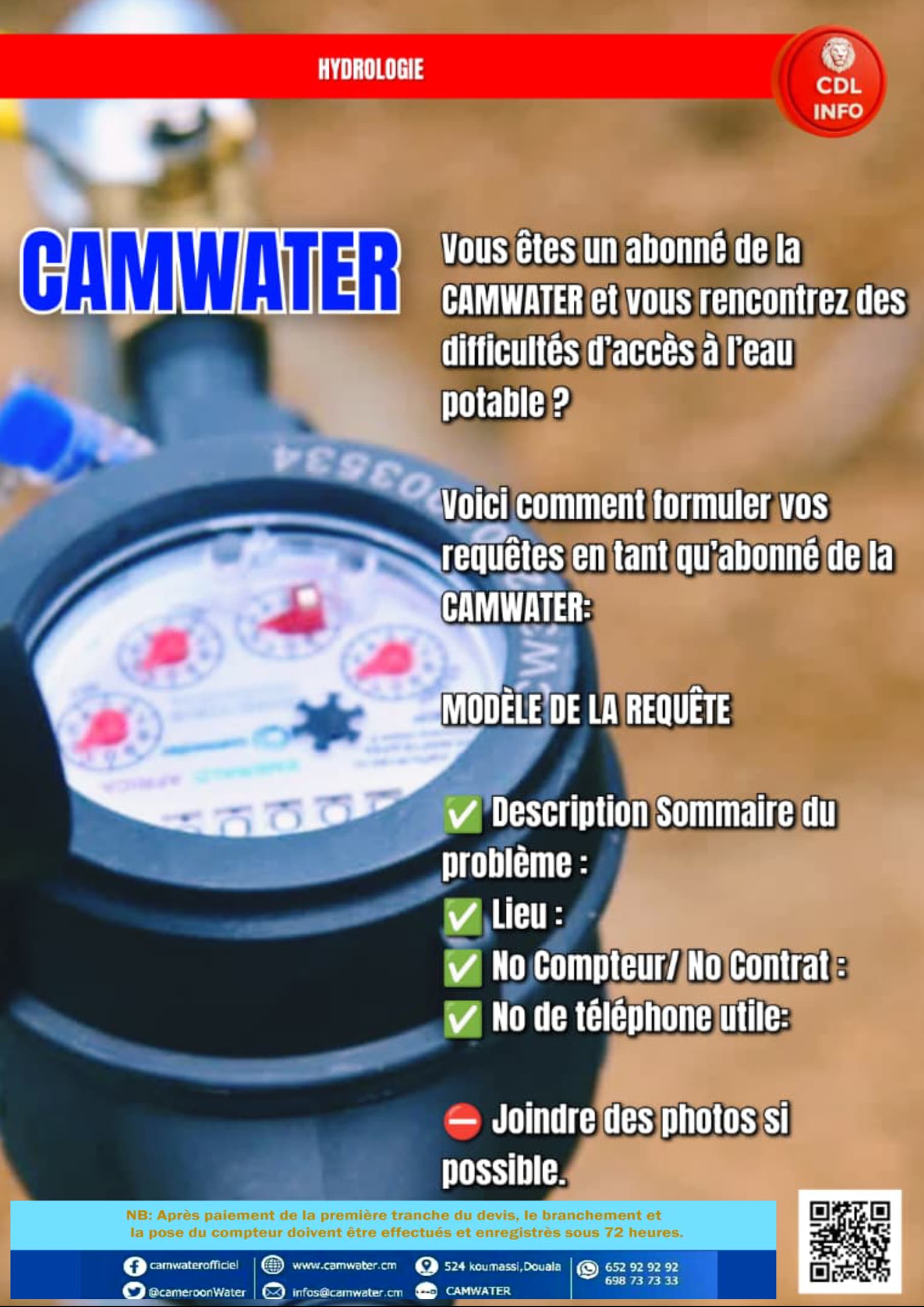 Actualités 22 avril 2026 CAMWATER : comment formuler les requêtes en cas de difficultés 0 COMMENT 55 Views Print EMail Share On Facebook Tweet On Twitter Share Tweet Share Pin Send Share Le modèle de requête de la Cameroon Water Utilities Corporation (CAMWATER). Communication CAMWATER Publications similaires : Ballon d’or France football : la fin d’une ère CAN 2019 : le gouvernement crie à l’injustice Can 2019 : coup de gueule de Martin Camus Mimb Culture : AYISSI NGA le créateur des vêtements Streets Previous post Région du Sud : CHEC évolue dans les travaux de construction d’un pont Next post Cameroun : le MINTSS décline la date de la « Marche du travailleur » Share Tweet Share Pin Send Share Laisser un commentaire Annuler la réponseVotre adresse e-mail ne sera pas publiée. Les champs obligatoires sont indiqués avec *Commentaire * Nom * E-mail * Site web