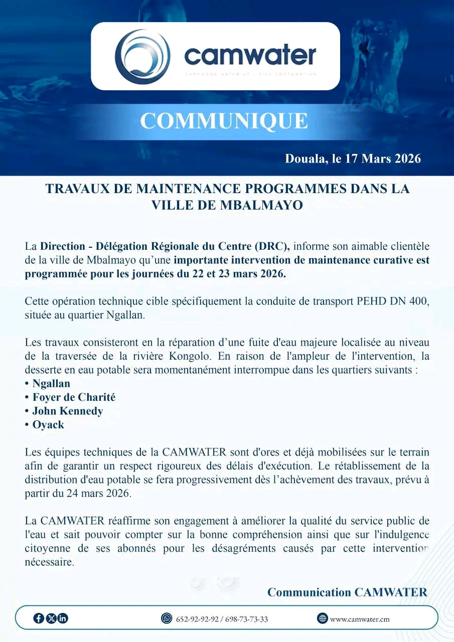 Actualités 18 mars 2026 CAMWATER : TRAVAUX DE MAINTENANCE PROGRAMMÉS A MBALMAYO 0 COMMENT 155 Views Print EMail Share On Facebook Tweet On Twitter Share Tweet Share Pin Send Share Ces travaux, menés sous la houlette de la Délégation Régionale de la Cameroon Water Utilities Corporation pour la Région du Centre, seront effectués du 22 au 23 mars 2026. Bertrand TJANI Publications similaires : Ballon d’or France football : la fin d’une ère CAN 2019 : le gouvernement crie à l’injustice Can 2019 : coup de gueule de Martin Camus Mimb Culture : AYISSI NGA le créateur des vêtements Streets Previous post Amélioration de la production à Yaoundé : le Dg de CAMWATER félicite les soldats de l’eau potable Next post Reconstruction de la section Mora-Tchakamari : aménagement des accotements Share Tweet Share Pin Send Share Laisser un commentaire Annuler la réponseVotre adresse e-mail ne sera pas publiée. Les champs obligatoires sont indiqués avec *Commentaire * Nom * E-mail * Site web
