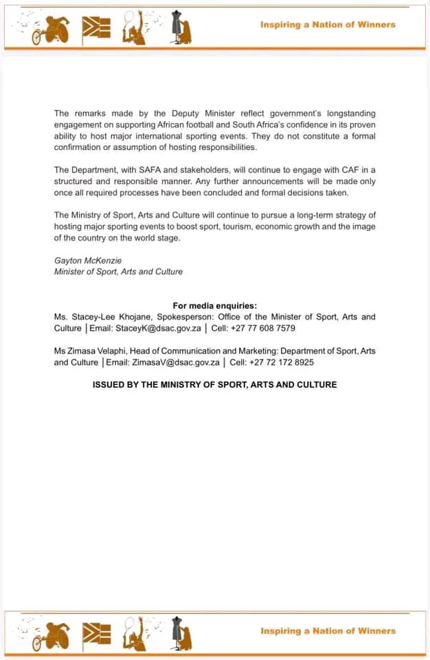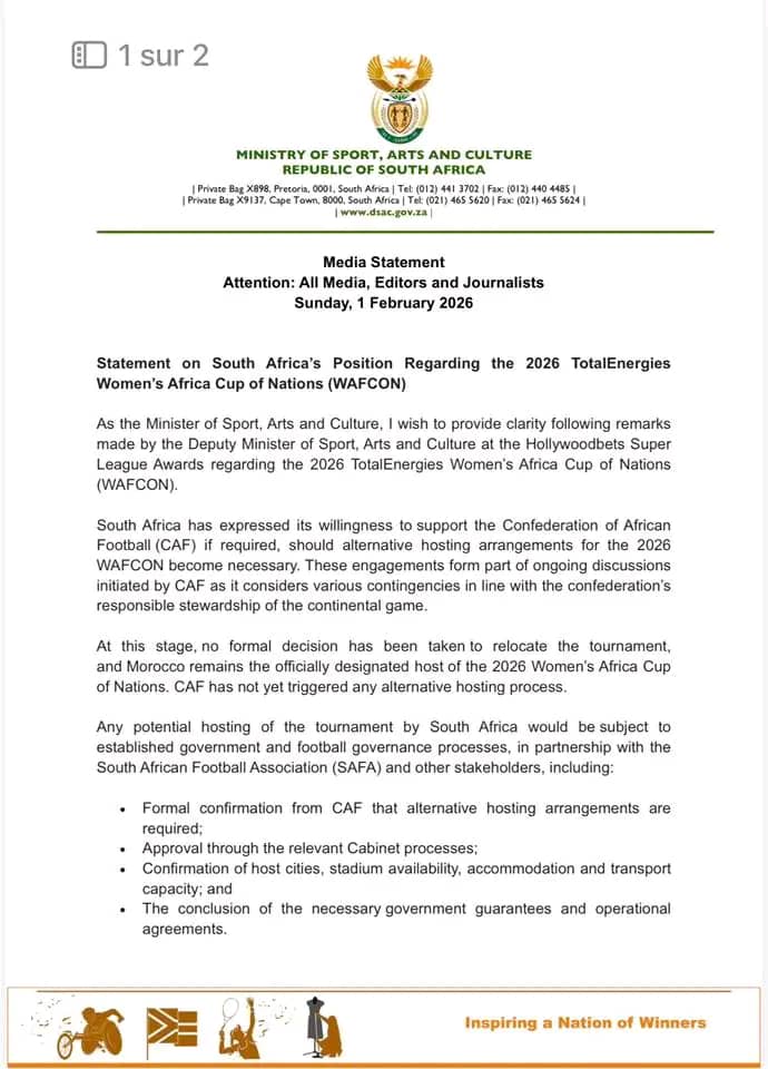 Dans un communiqué officiel signé par le ministre Gayton McKenzie, l’Afrique du Sud précise que le pays n’a jamais officiellement annoncé qu’il accueillerait le tournoi. Le Maroc demeure l’hôte officiel à ce stade. L’Afrique du Sud se dit simplement « prête à soutenir la CAF » si une solution alternative devenait nécessaire.