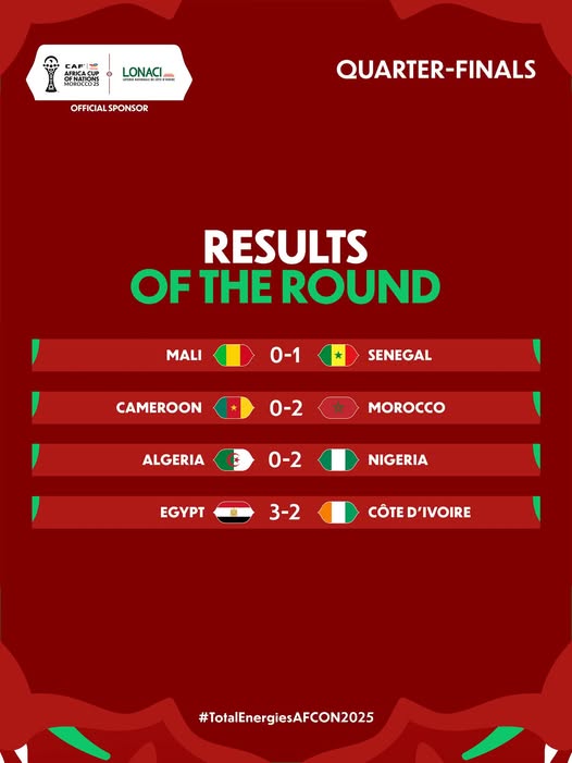 Quatre nations ont obtenu leurs tickets pour les demi-finales de la coupe d’Afrique des nations et donnera deux affiches notamment Maroc-Nigeria et Egypte-Sénégal qui se disputera ce mercredi 14 Janvier 2026.