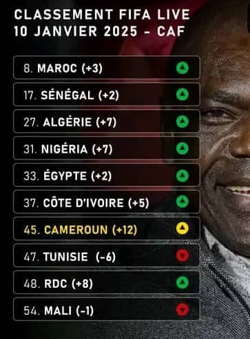 Le Cameroun, 45e mondial, réalise la plus spectaculaire montée du continent avec un gain de 12 points au classement FIFA. Cette performance place les « Lions Indomptables » au 7e rang africain, en pleine Coupe d’Afrique des Nations (CAN) 2026 au Maroc.