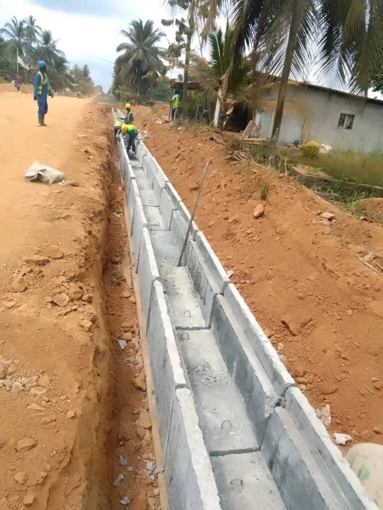L’entreprise est bien mobilisée sur le terrain et les principales activités en cours à date concernent aussi bien la pose des éléments pré-fabriqués constitutifs des dalots et caniveaux prévus dans le contrat et la préparation de la mise en forme de la plateforme. Sur les 11 dalots prévus dans le projet, 10 sont en cours de réalisation.