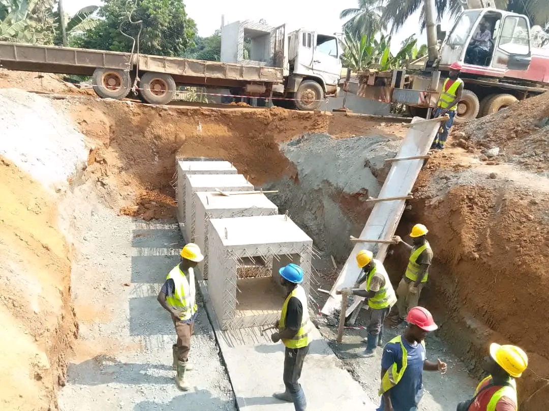 L’entreprise est bien mobilisée sur le terrain et les principales activités en cours à date concernent aussi bien la pose des éléments pré-fabriqués constitutifs des dalots et caniveaux prévus dans le contrat et la préparation de la mise en forme de la plateforme. Sur les 11 dalots prévus dans le projet, 10 sont en cours de réalisation.
