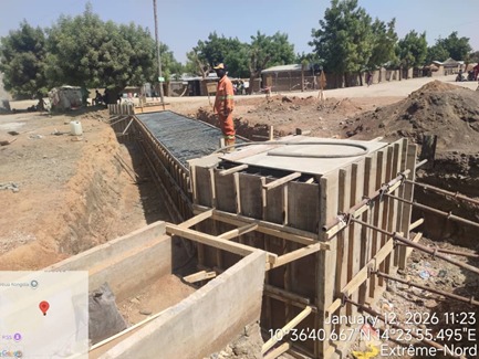 L’entreprise a opté pour les caniveaux préfabriqués posés. Sur l’axe principal, l’entreprise avance avec les travaux de la couche de roulement en BBSG 0/14. Les 56 ouvrages hydrauliques de l’axe principal sont bétonnés et les blocs techniques réalisés. Les travaux de la semaine ont concerné le bétonnage du reste du dernier ouvrage de la voirie de Maroua OH4.