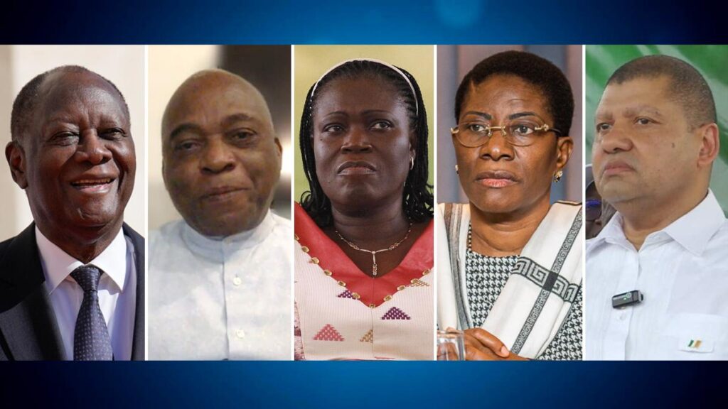 Deux hommes et deux femmes sont en lice pour succéder au président sortant, Alassane Ouattara, 83 ans, qui brigue un quatrième mandat à la tête du pays. Simone Ehivet, 76 ans, ex épouse de Laurent Gbagbo et ex première dame du pays et femme politique, Henriette Lagou, 66 ans, ancienne ministre et femme politique, Jean-Louis Billon, 60 ans, ancien ministre et homme politique et Ahoua Don Mello, 67 ans, enseignant chercheur et homme politique, sont des candidats qui ont franchi toutes les étapes de validation des candidatures. Au départ, les services compétents ont reçu 60 dossiers de candidatures en vue de la présidentielle. Au terme de l’examen des dossiers, seuls cinq noms émergent.