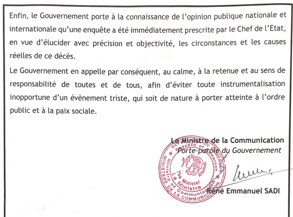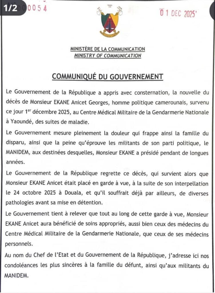 Actualités 1 décembre 2025 Décès d’Anicet Ekanè : le gouvernement du Cameroun communique 0 COMMENT 747 Views Print EMail Share On Facebook Tweet On Twitter Share Tweet Share Pin Send Share La sortie médiatique du Ministre de la Communication du Cameroun, René Emmanuel Sadi, fait suite de la disparition de cet homme politique, ce 1er décembre 2025. Source : celcom MINCOM Publications similaires : Ballon d’or France football : la fin d’une ère CAN 2019 : le gouvernement crie à l’injustice Can 2019 : coup de gueule de Martin Camus Mimb Culture : AYISSI NGA le créateur des vêtements Streets Previous post SESSION ORDINAIRE DU COMITÉ AFRICAIN D’EXPERTS SUR LES DROITS ET LE BIEN-ÊTRE DE l’ENFANT : DÉCLARATION DE LA COMMISSION DES DROITS DE L’HOMME DU CAMEROUN Next post Awae-Esse-Soa : cap sur les travaux résiduels Share Tweet Share Pin Send Share Laisser un commentaire Annuler la réponseVotre adresse e-mail ne sera pas publiée. Les champs obligatoires sont indiqués avec *Commentaire * Nom * E-mail * Site web