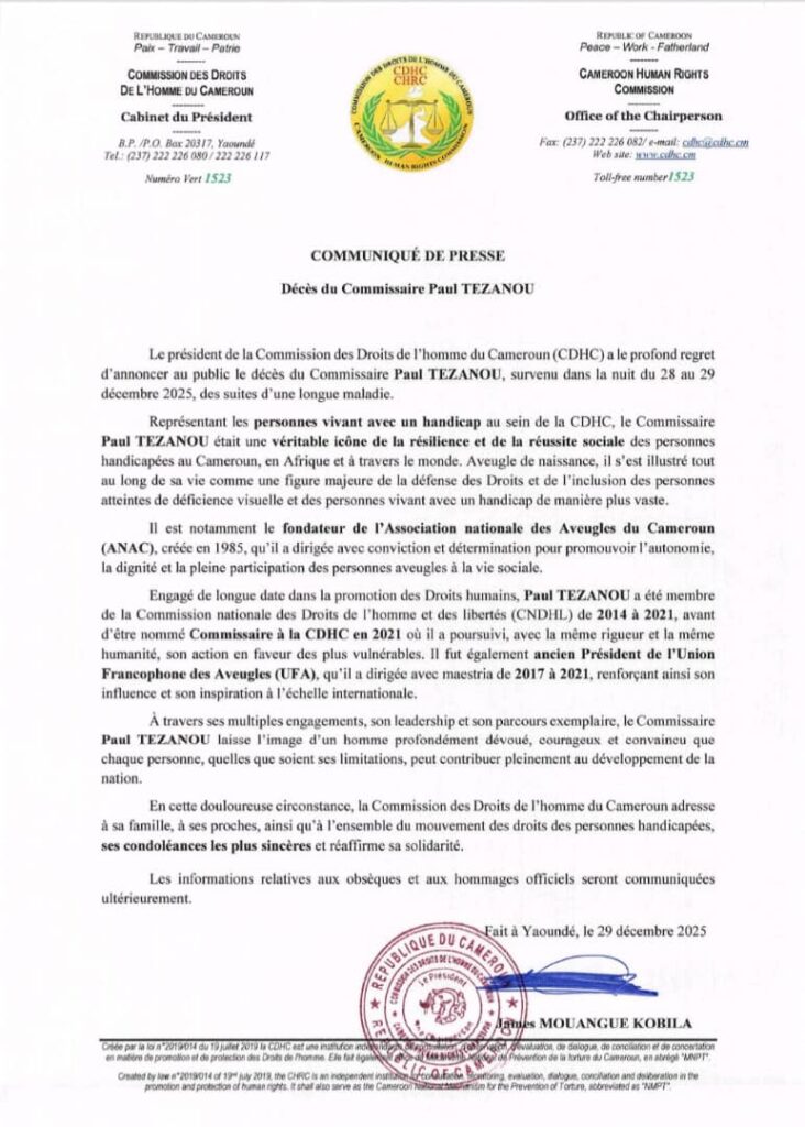 Actualités 29 décembre 2025 Décès : le communiqué de la CDHC 0 COMMENT 149 Views Print EMail Share On Facebook Tweet On Twitter Share Tweet Share Pin Send Share Source : celcom CDHC Publications similaires : Ballon d’or France football : la fin d’une ère CAN 2019 : le gouvernement crie à l’injustice Can 2019 : coup de gueule de Martin Camus Mimb Culture : AYISSI NGA le créateur des vêtements Streets Previous post Guidiguis–Yagoua (68,70 km) : la cadence des terrassements et la construction des ouvrages appréciables Next post Ngomedzap, pôle agro-pastoral d’excellence: des actions concrètes en vue de l’atteinte de cette ambition Share Tweet Share Pin Send Share Laisser un commentaire Annuler la réponseVotre adresse e-mail ne sera pas publiée. Les champs obligatoires sont indiqués avec *Commentaire * Nom * E-mail * Site web