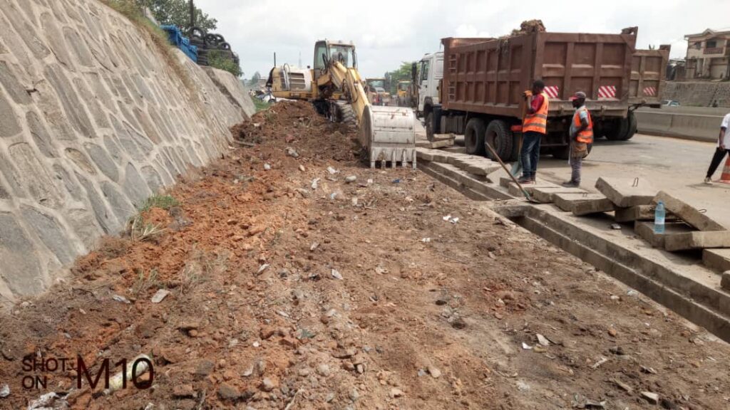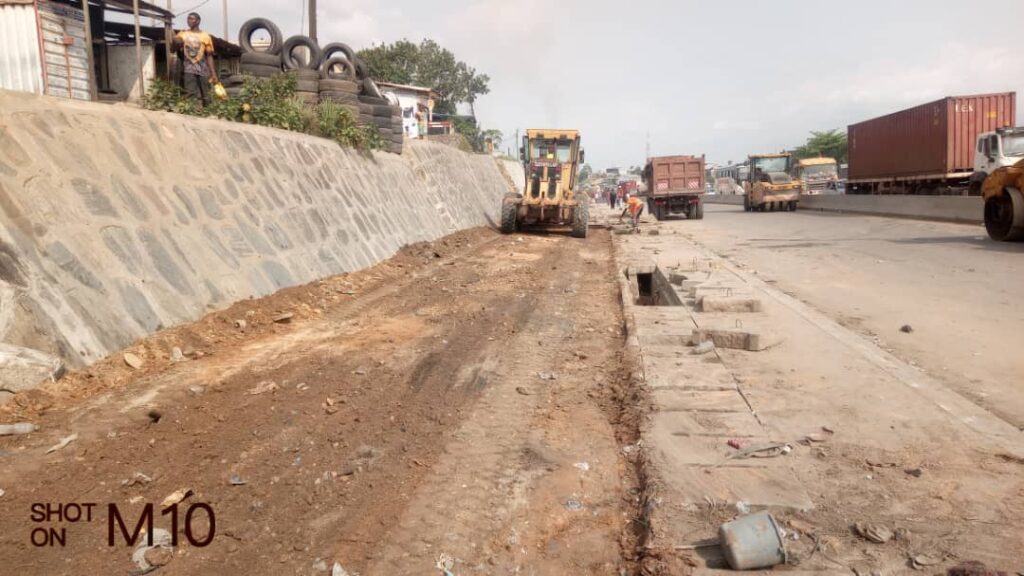 Les travaux s’effectuent actuellement au lieu-dit Tradex Boko. Pour ce qui est des travaux d’assainissement, ils connaissent eux aussi une avancée. Les caniveaux sont posés dans les sens 1 et 2 sur l’ensemble de l’itinéraire et les bordures de type T3CS3 recouvrent 7720 ml dans le sens 1 et 7390 ml dans le sens 2.