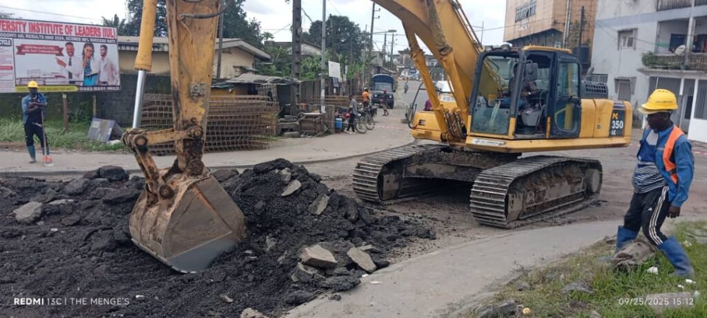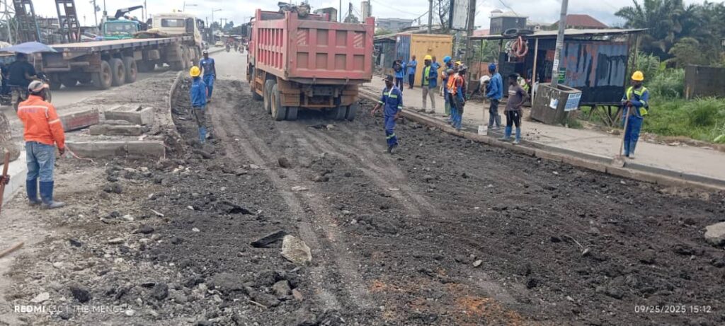 Le jeudi 25 septembre 2025, l’entreprise en charge des travaux, CHFECC, a procédé au décapage des couches existantes de chaussée sur le demi-côté restant du giratoire Sapeur avant leur substitution par de la pouzzolane et de la grave concassée 0/31,5 améliorée au ciment. Conformément aux instructions validées par le Maître d’Ouvrage, la couche de roulement est désormais réalisée en béton armé.