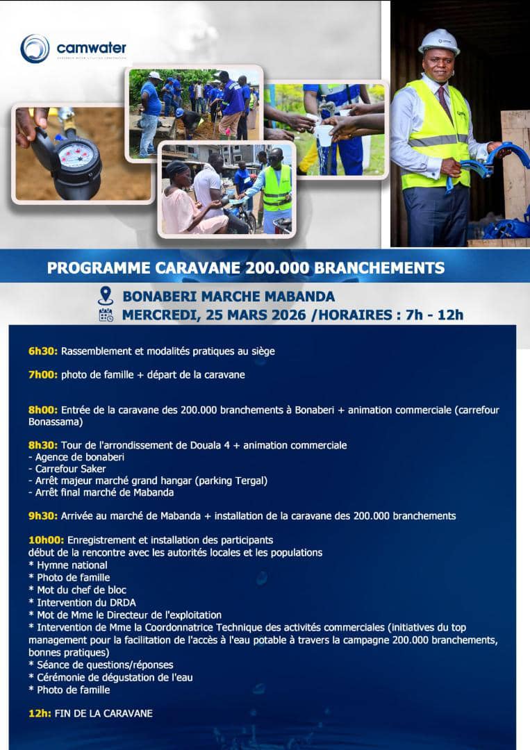 Actualités 25 mars 2026 ÉVÉNEMENT CAMWATER : CARAVANE 200.000 BRANCHEMENTS A DOUALA 4e 0 COMMENT 329 Views Print EMail Share On Facebook Tweet On Twitter Share Tweet Share Pin Send Share C’est ce mercredi, 25 mars 2026, dans cet arrondissement de la cité économique du Cameroun. COMMUNICATION CAMWATER Publications similaires : Ballon d’or France football : la fin d’une ère CAN 2019 : le gouvernement crie à l’injustice Can 2019 : coup de gueule de Martin Camus Mimb Culture : AYISSI NGA le créateur des vêtements Streets Previous post Législatives et Municipales 2026 : LA MARCHE RASSURANTE DE MOMBO ONE MOP POUR LA VICTOIRE Next post Caravane 200 000 branchements : CAMWATER répond aux besoins des populations de Douala 4è Share Tweet Share Pin Send Share Laisser un commentaire Annuler la réponseVotre adresse e-mail ne sera pas publiée. Les champs obligatoires sont indiqués avec *Commentaire * Nom * E-mail * Site web