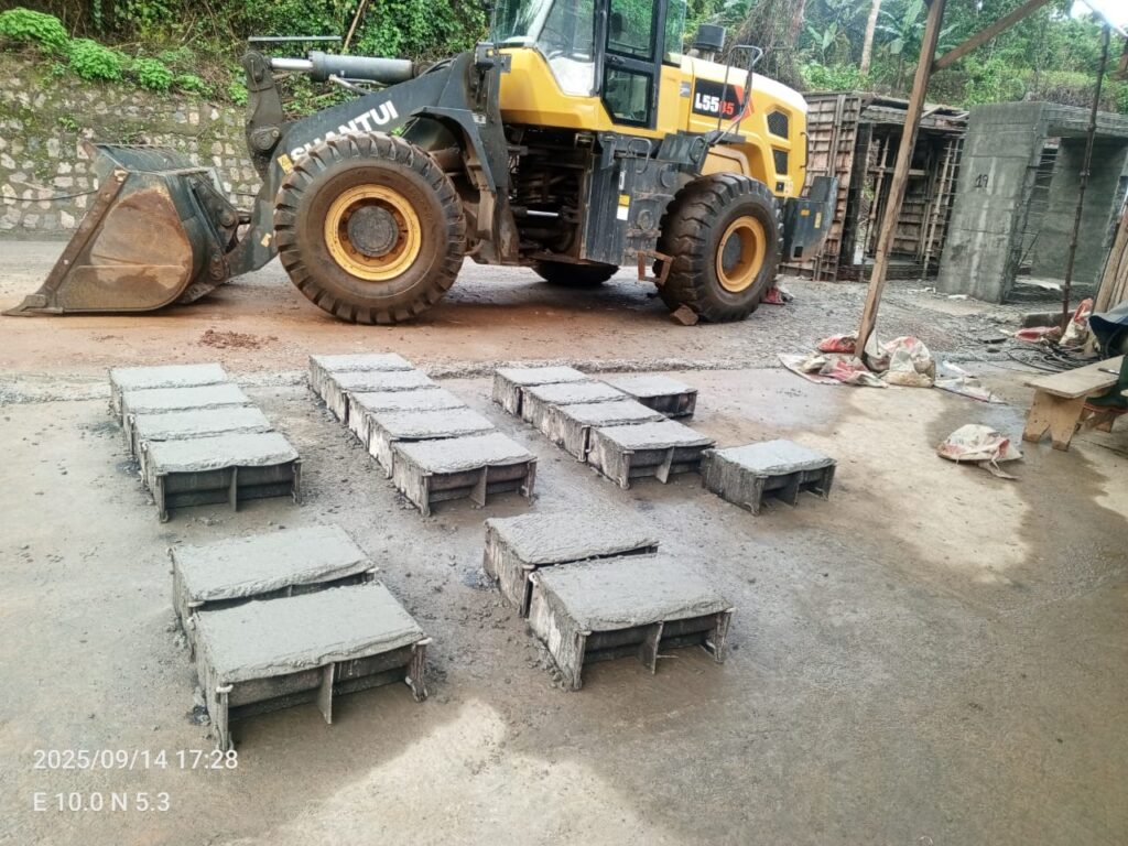 Les journées du 13 et du 14 septembre ont permis d’enregistrer des avancées concrètes. La préfabrication a atteint 9,5 mètres linéaires de bordures de type T2 et jusqu’à deux mètres linéaires de dalots 2 x 2 par jour. Les travaux de façonnage et de tissage des aciers se sont poursuivis dans les ateliers. Dans le même temps, le transport des pierres destinées à l’enrochement s’est intensifié avec dix-huit camions mobilisés le 13 septembre, ce qui contribue à la stabilisation progressive des talus et à la sécurité du site.
