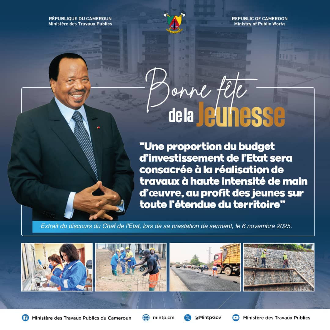 Actualités 11 février 2026 Fête de la jeunesse 2026 : le Ministère des Travaux Publics de tout cœur avec la jeunesse 0 COMMENT 366 Views Print EMail Share On Facebook Tweet On Twitter Share Tweet Share Pin Send Share Source : celcom MINTP Publications similaires : Ballon d’or France football : la fin d’une ère CAN 2019 : le gouvernement crie à l’injustice Can 2019 : coup de gueule de Martin Camus Mimb Culture : AYISSI NGA le créateur des vêtements Streets Previous post Eau et assainissement : Yaoundé au cœur des solutions africaines Next post 60è édition de la fête de la Jeunesse : des jeunes découvrent l’Immeuble-siège du MINTP Share Tweet Share Pin Send Share Laisser un commentaire Annuler la réponseVotre adresse e-mail ne sera pas publiée. Les champs obligatoires sont indiqués avec *Commentaire * Nom * E-mail * Site web