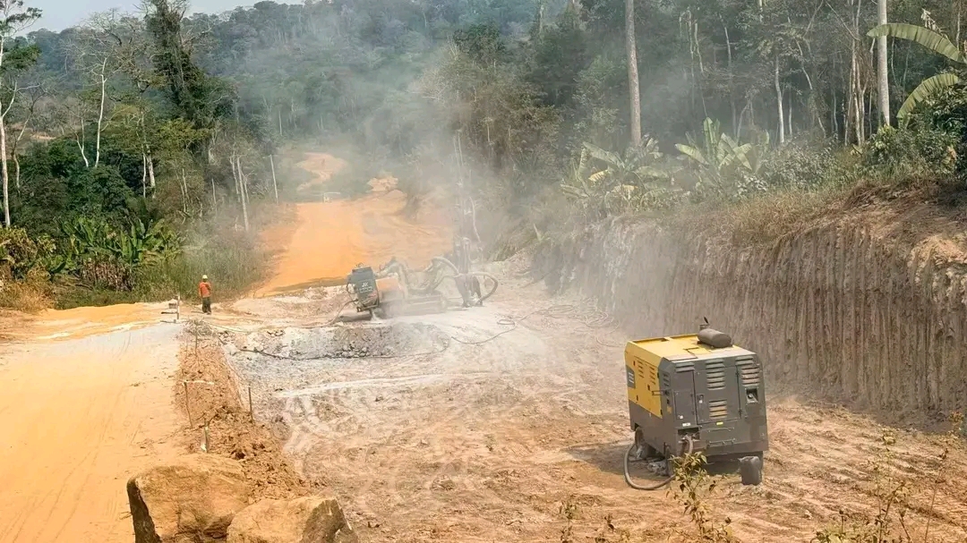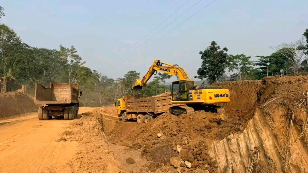 Aux alentours du site, l’emprise est entièrement dégagée et les engins de l’entreprise se déploient aisément. Les travaux en cours concernent à la fois les terrassements de la voie d’accès à l’ouvrage à construire et les opérations préliminaires à l’implantation des pieux. Plusieurs engins ont été disposés sur le site, de même que les personnels de l’entreprise. L’ouvrage à construire est un pont mixte de 130 mètres, dont les travaux préparatoires ont débuté en août 2025.
