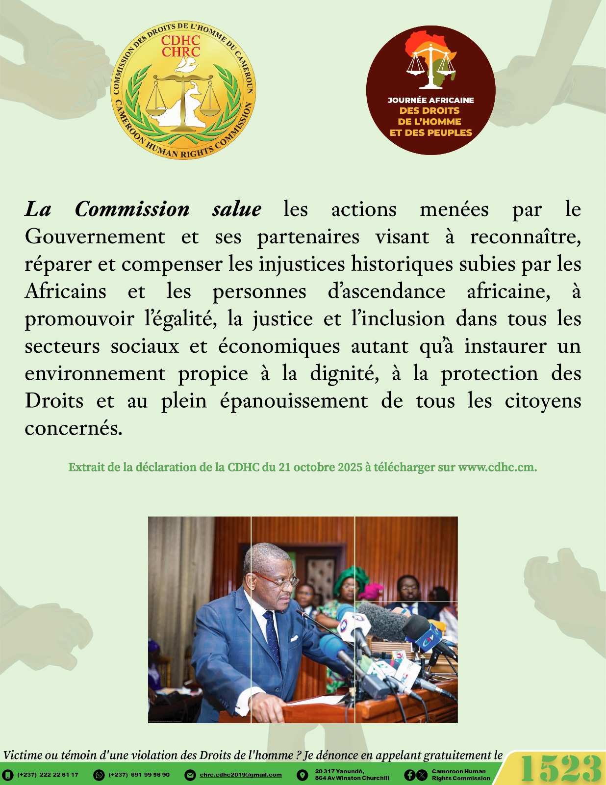 La Commission relève que sur les 220 recommandations acceptées par l’État à l’occasion de l’adoption du Rapport du passage du Cameroun au 4e cycle de l’Examen périodique universel (EPU) le 26 mars 2024, huit sont en consonance avec la thématique de l’édition 2025 de la Journée africaine des Droits de l’homme et des peuples ; elles sont reproduites dans la Déclaration de la CDHC de ce jour, après avoir été ventilées par l’Institution nationale des Droits de l’homme du pays aux structures pertinentes de l’État et aux institutions spécialisées, chacune en ce qui la concerne.