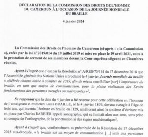 3 janvier 2024 20240103_100803-1 0 COMMENT 74 Views Print EMail Share On Facebook Tweet On Twitter Share Tweet Share Pin Send Share Previous post Journée mondiale du braille : la déclaration de la Commission des Droits de l’Homme du Cameroun Share Tweet Share Pin Send Share Laisser un commentaire Annuler la réponseVotre adresse e-mail ne sera pas publiée. Les champs obligatoires sont indiqués avec *Commentaire * Nom * E-mail * Site web