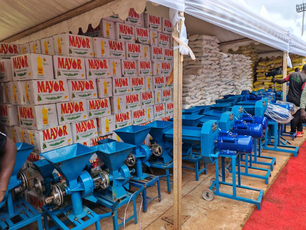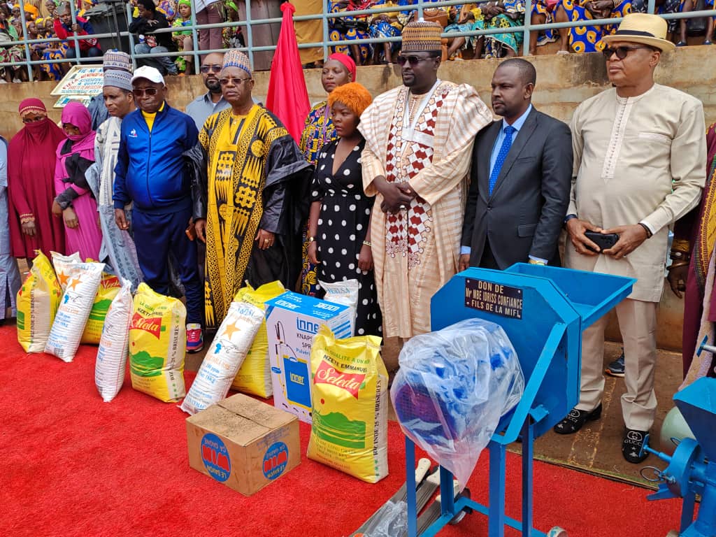 Avec le soutien de ses partenaires asiatiques et amis, dont le directeur général du groupe Baba Danpoulo, le généreux donateur a mis à la disposition de ces derniers, un important lot constitué de 2 000 sacs de riz, 2 000 sacs de sel, 2 000 cartons d’huile végétales, 2 000 cartons de savon, 2 000 cartons de craie et couleurs, 10 000 machettes, 50 machines à écraser, 1 000 parapluies, et 250 pulvérisateurs. C’était en présence du gouverneur Awa Fonka Augustine entouré de son état-major et des autorités traditionnelles de la localité, (dont le chef supérieur Bamoungoum) venues encourager leur valeureux fils, lui apporter leurs bénédictions et soutenir cette belle aventure humanitaire.