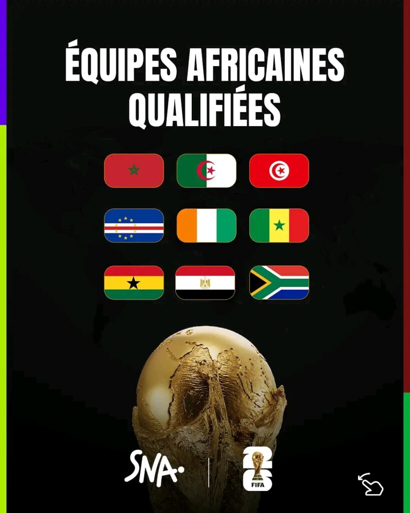 Bénéficiant de l’élargissement à 48 nations participantes, neuf (09) nations africaines ont obtenu leur ticket pour le mondial américain 2026. Il s’agit du Maroc, Algérie, Tunisie, Cap vert ,Cote d’ivoire, Sénégal, Ghana, Egypte et l’Afrique du Sud.