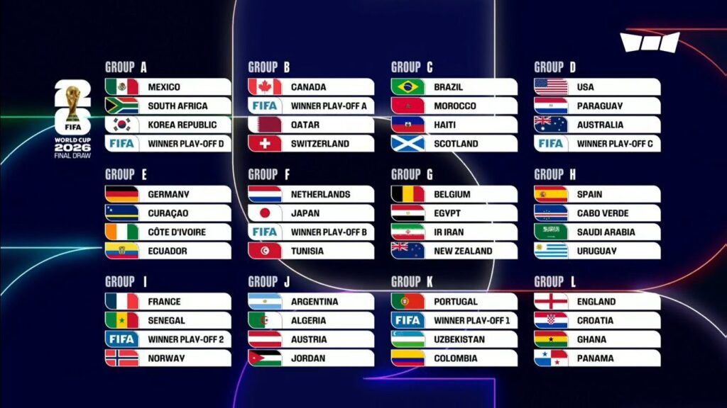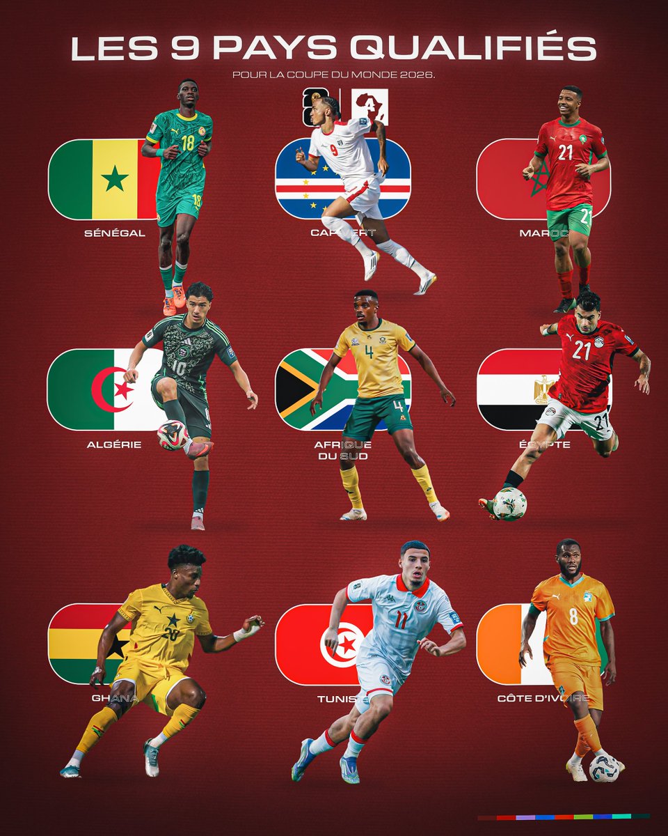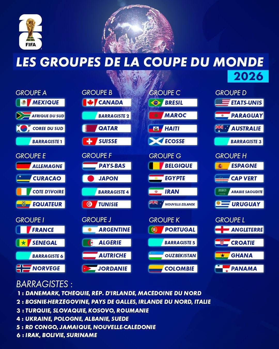 À six mois du début du Mondial americain, le tirage au sort a rendu son verdict, ce 5 décembre 2025, à Washington. Neuf nations africaines vont prendre part à la plus prestigieuse compétition internationale : le Maroce ,le Sénégal, l’Egypte, la Tunisie, l’Algerie, la Cote d’Ivoire, l’Afrique du Sud , le Cap Vert et le Ghana. La RD Congo pourrait les rejoindre en cas de succès en barrage face à la Jamaïque ou à la Nouvelle-Calédonie.