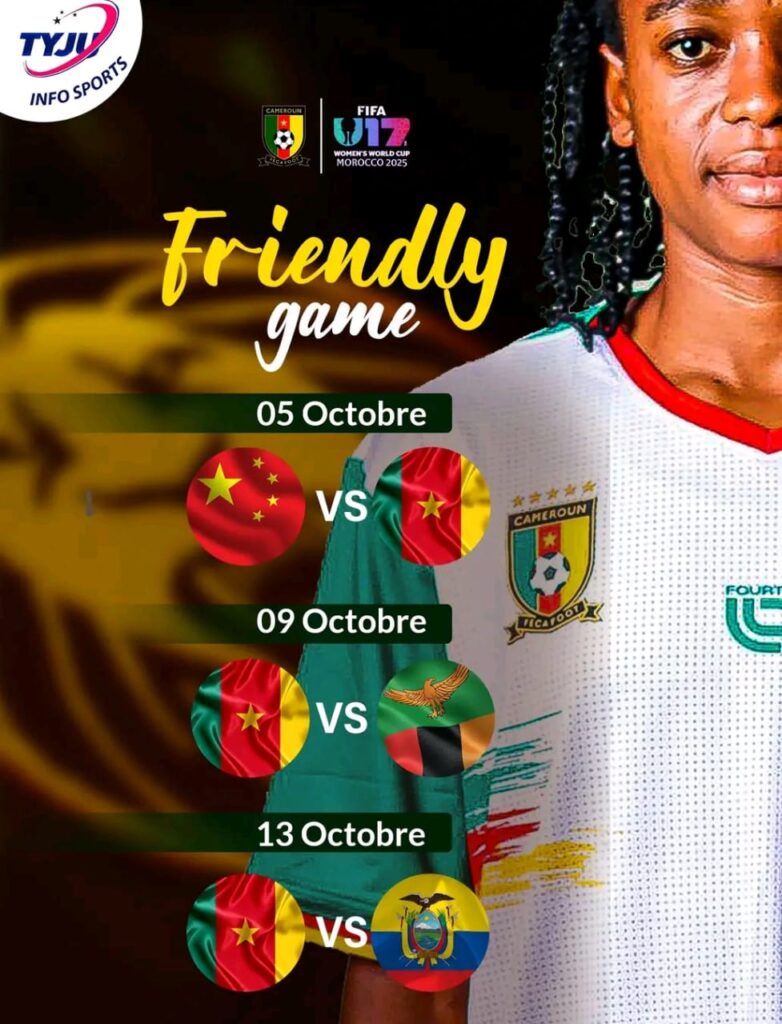 En marge du Mondial FémininU17 2025, l’équipe des lionnes indomptables U17 va s’envoler pour poursuivre son stage de préparation pour le Maroc ce 02 octobre 2025 et va disputer trois rencontres amicales, face à la Chine, Zambie et l’équateur.
