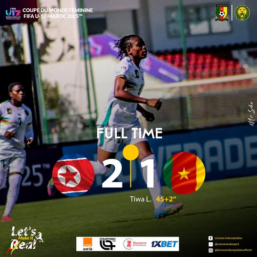 Le Cameroun battu par la Corée du Nord (2-1), ce 21 octobre 2025, lors de la deuxième journée de la Coupe du monde U17, . L’unique but des Lionnes a été inscrit par Tiwa Lys Fraîche. Le prochain match décisif pour une qualification au second tour est prévu vendredi face au Mexique.