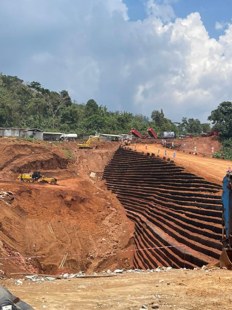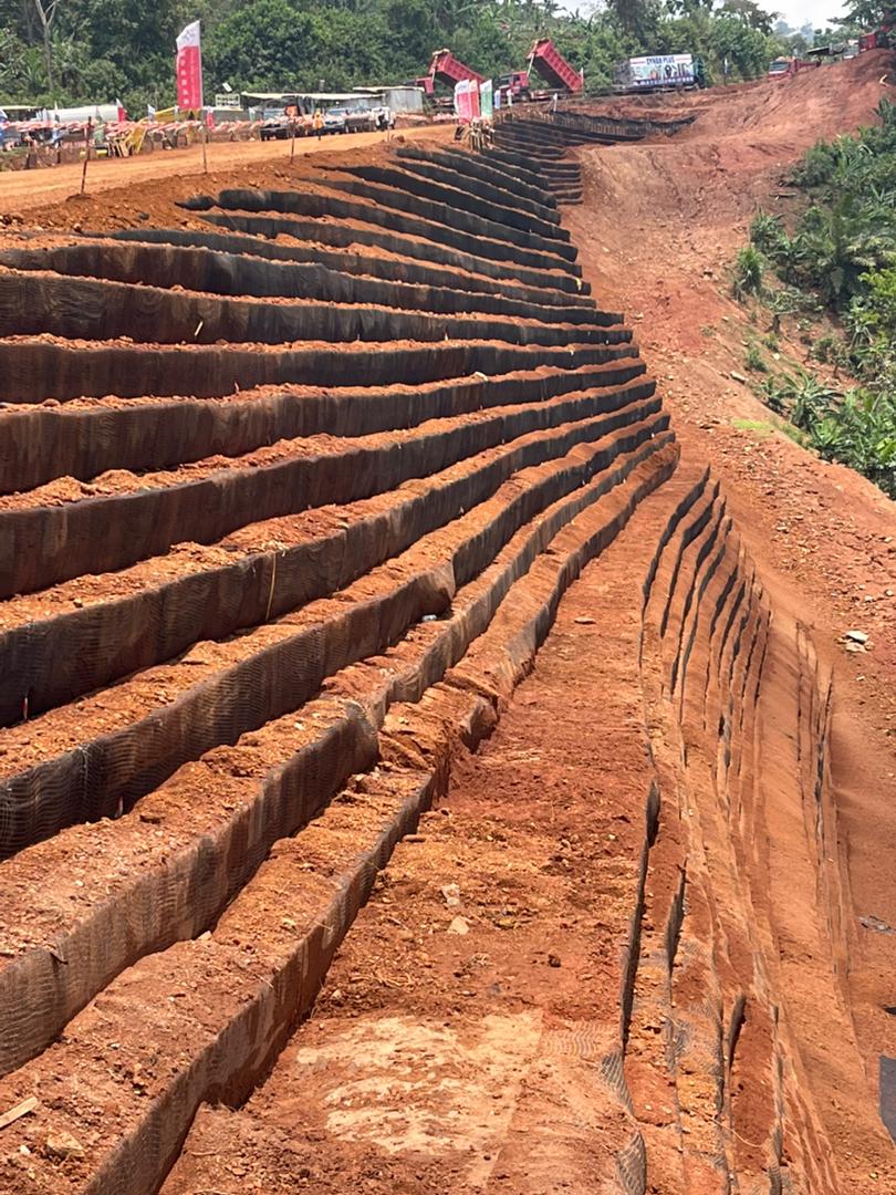 Les travaux, exécutés par l’entreprise CFHEC sous la supervision du bureau d’études ECTA BTP, affiche un taux d’avancement de 91,55 %. Il intègre une technique innovante de remblai renforcé par géosynthétiques, dont la durée de vie est estimée à près de 100 ans selon la mission de contrôle.