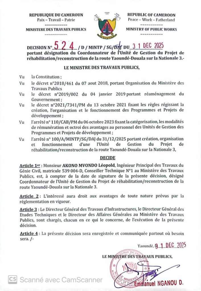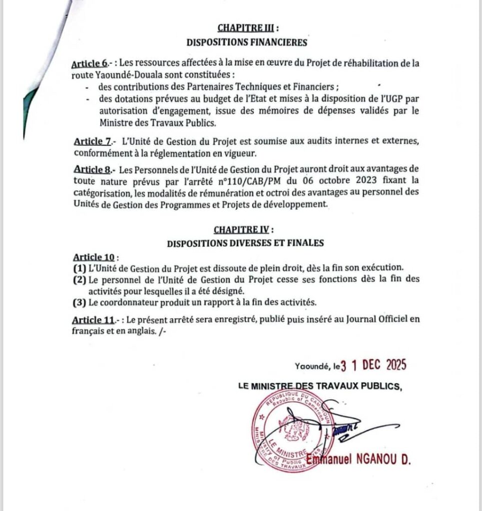 Pour mettre en œuvre ces actions, le Ministre des Travaux Publics a mis sur pied, une Unité de Gestion du projet de réhabilitation de la route Yaoundé-Douala, dispositif institutionnel approprié et surtout d’efficacité, qui aura pour but de coordonner l’exécution les travaux ainsi envisagés, dans un délai maximal de dix mois. Lesdits travaux vont s’exécuter en deux sections : Yaoundé (Poste Centrale) – Pont de Ndoupé (127 km) et Pont de Ndoupé – Douala (Pont sur la Dibamba) (109 km). Au cours d’une réunion stratégique présidée par le Ministre des Travaux Publics le 30 décembre 2025, les grands contours de cette intervention ont été arrêtés et le calendrier des actions est finalisé. La création d’une unité spécifique, la désignation dans les prochains jours des responsables chargés de conduire à bien cette mission et la consultation des entreprises, sont autant d’éléments qui vont davantage rendre concrets, les engagements du Chef de l’Etat.