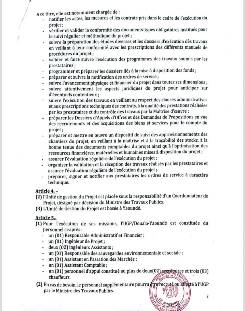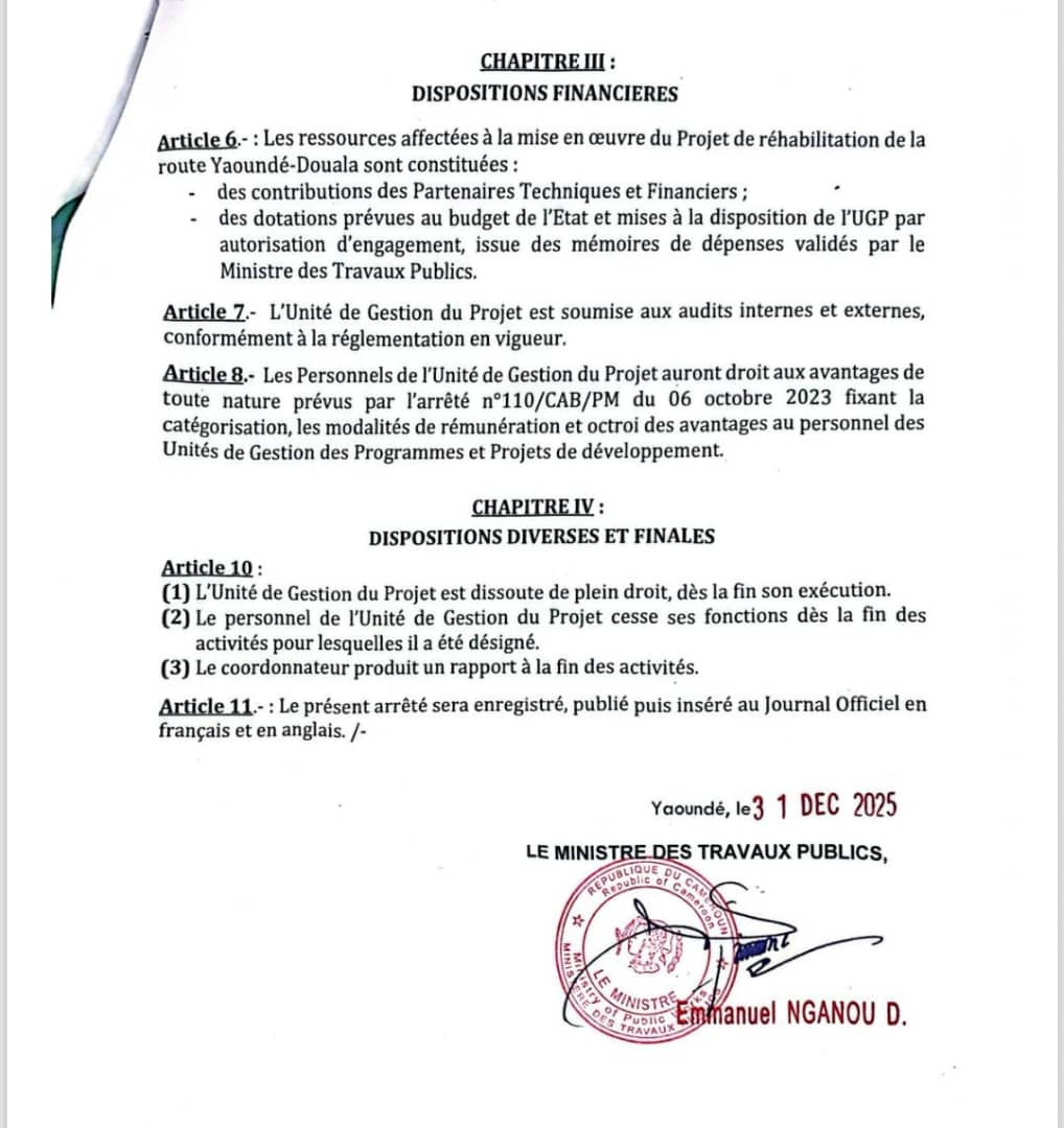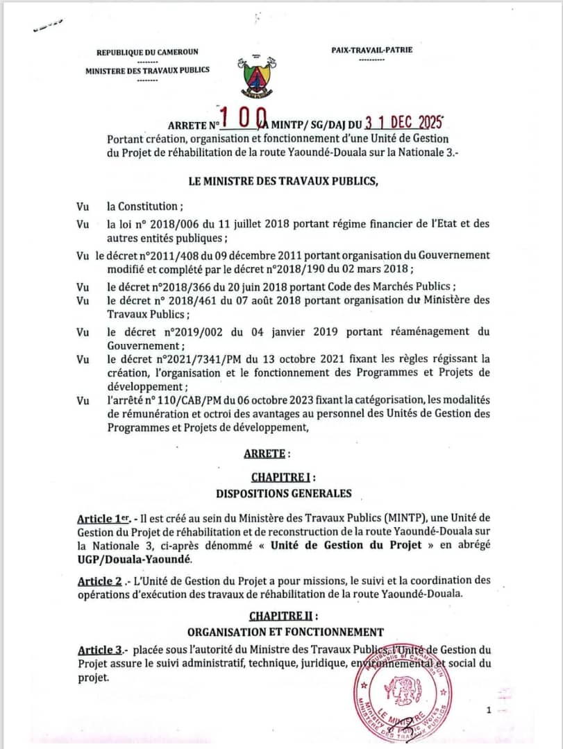 Pour mettre en œuvre ces actions, le Ministre des Travaux Publics a mis sur pied, une Unité de Gestion du projet de réhabilitation de la route Yaoundé-Douala, dispositif institutionnel approprié et surtout d’efficacité, qui aura pour but de coordonner l’exécution les travaux ainsi envisagés, dans un délai maximal de dix mois. Lesdits travaux vont s’exécuter en deux sections : Yaoundé (Poste Centrale) – Pont de Ndoupé (127 km) et Pont de Ndoupé – Douala (Pont sur la Dibamba) (109 km). Au cours d’une réunion stratégique présidée par le Ministre des Travaux Publics le 30 décembre 2025, les grands contours de cette intervention ont été arrêtés et le calendrier des actions est finalisé. La création d’une unité spécifique, la désignation dans les prochains jours des responsables chargés de conduire à bien cette mission et la consultation des entreprises, sont autant d’éléments qui vont davantage rendre concrets, les engagements du Chef de l’Etat.