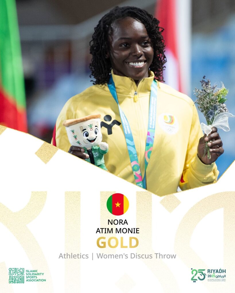 L’athlète camerounaise spécialiste du lancer de disque et du lancer de poids, Nora Atim Monie, offre la première médaille d’or au Cameroun avec un jet mesuré à 57,07 mètres aux Jeux de la Solidarité islamique à Riyad en Arabie saoudite.