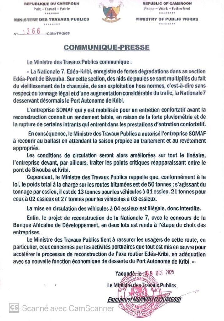 Actualités 9 octobre 2025 Route Edéa-Kribi : le Mintp prend une mesure 0 COMMENT 194 Views Print EMail Share On Facebook Tweet On Twitter Share Tweet Share Pin Send Share Objectif, améliorer les conditions de circulation sur tout le linéaire. Source : celcom MINTP Publications similaires : Ballon d’or France football : la fin d’une ère CAN 2019 : le gouvernement crie à l’injustice Can 2019 : coup de gueule de Martin Camus Mimb Culture : AYISSI NGA le créateur des vêtements Streets Previous post Magada-Guidiguis et Guidiguis-Yagoua : le gouvernement mobilise plus de 80 milliards pour la réhabilitation de la route entamée Next post Reconstruction de la route Ngaoundéré-Garoua : CFHEC démarre les travaux de maintien de la circulation sur le lot 4 Share Tweet Share Pin Send Share Laisser un commentaire Annuler la réponseVotre adresse e-mail ne sera pas publiée. Les champs obligatoires sont indiqués avec *Commentaire * Nom * E-mail * Site web