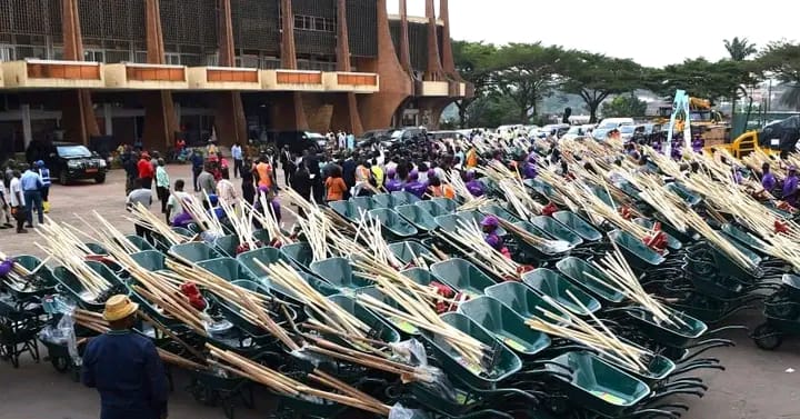 Sous les yeux de Luc Messi Atangana, le maire de la Ville et du président des Communes et Villes unies du Cameroun (CVUC), Augustin Tamba, le MINAT a présenté l’ensemble du matériel du jour qui se compose de 700 brouettes, 700 pelles, 700 balais et 700 râteaux. Ainsi, chacune des sept communes d’arrondissement bénéficiera de 100 pièces des éléments exposés.