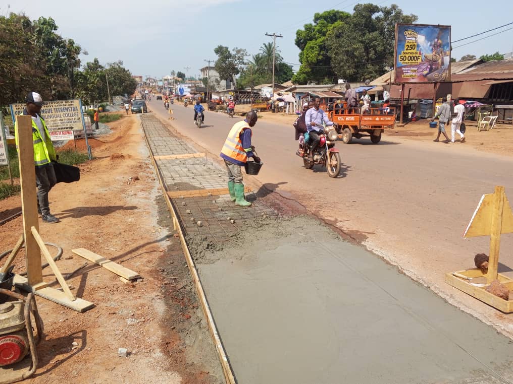 Les équipes déployées en zone urbaine interviennent depuis les premières heures de la matinée, conformément au planning établi pour améliorer progressivement le niveau de service de la chaussée. Cette activité, visible reflète l’avancement réel des travaux, loin des spéculations. Les interventions actuelles portent sur le décaissement et le traitement des nids de poules sur plusieurs sections de la traversée urbaine, tandis que la mise en œuvre des accotements en béton armé se poursuit de manière séquencée afin d’assurer la consolidation latérale de la chaussée.