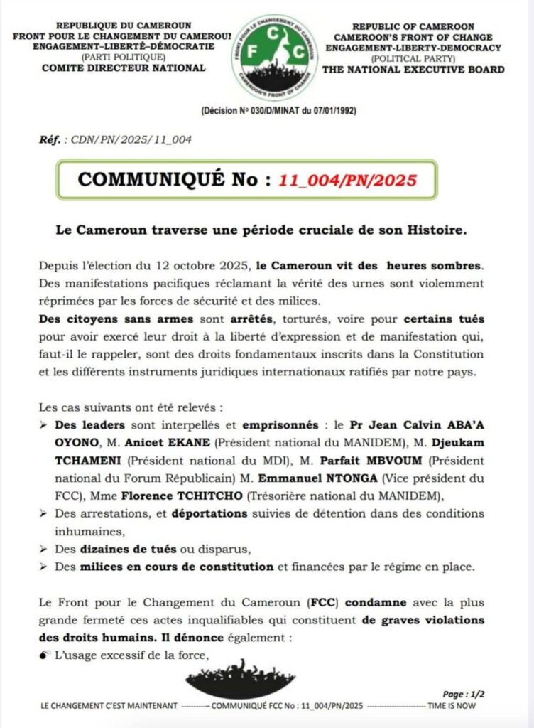« Depuis l’élection du 12 octobre 2025, le Cameroun vit des heures sombres. Des manifestations pacifiques réclamant la vérité des urnes sont violemment réprimées par les forces de sécurité et des milices. Des citoyens sans armes sont arrêtés, torturés, voire pour certains tués pour avoir exercé leur droit à la liberté d’expression et de manifestation qui, faut-il le rappeler, sont des droits fondamentaux inscrits dans la Constitution et les différents instruments juridiques internationaux ratifiés par notre pays », a écrit le président national du Front pour le changement du Cameroun (FCC), Jean Michel Nintcheu.