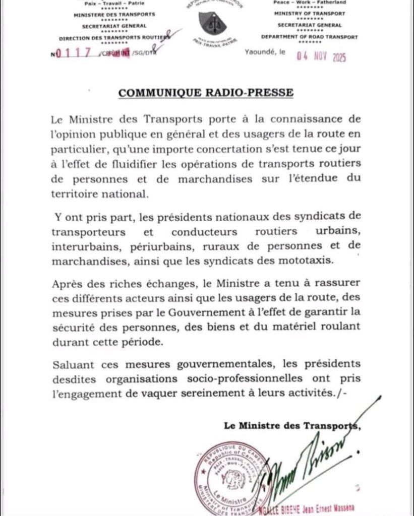 Le Ministère des Transports a annoncé, ce mardi 04 Novembre 2025 , à Yaoundé la reprise officielle des activités de transport de personnes et de marchandises sur toute l’étendue du territoire national à compter de ce mercredi 5 novembre 2025.