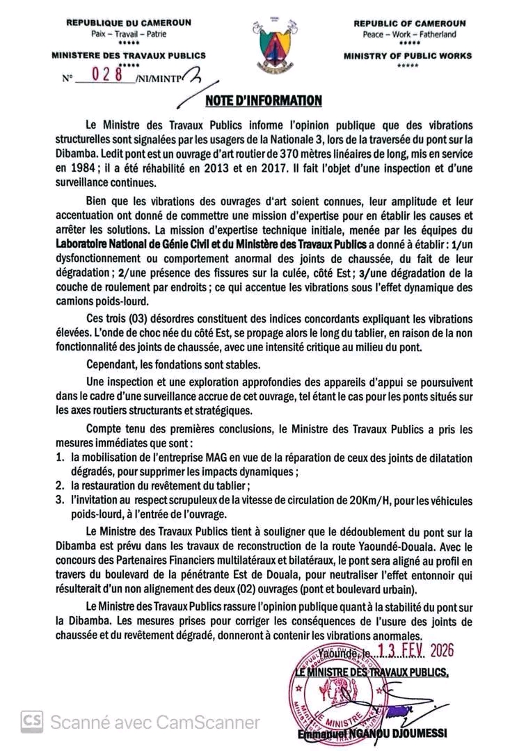 Actualités 14 février 2026 Vibrations du pont sur la Dibamba : les premières mesures du Ministre des Travaux Publics 0 COMMENT 371 Views Print EMail Share On Facebook Tweet On Twitter Share Tweet Share Pin Send Share Source : celcom MINTP Publications similaires : Ballon d’or France football : la fin d’une ère CAN 2019 : le gouvernement crie à l’injustice Can 2019 : coup de gueule de Martin Camus Mimb Culture : AYISSI NGA le créateur des vêtements Streets Previous post WCI FORUM : le Cameroun à l’honneur à Istanbul Next post Éliminatoires de la Coupe du Monde Féminine FIFA U20 Pologne 2026 : le Cameroun obtient son ticket pour le dernier tour Share Tweet Share Pin Send Share Laisser un commentaire Annuler la réponseVotre adresse e-mail ne sera pas publiée. Les champs obligatoires sont indiqués avec *Commentaire * Nom * E-mail * Site web