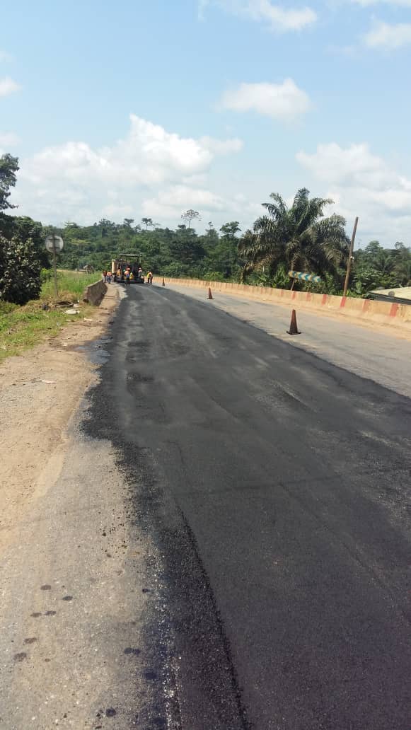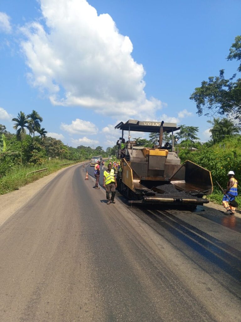 Au niveau du parc de Boumyebel, les équipes ont procédé à un déflachage, dans le but de corriger les dégradations observées sur le côté droit de la voie, en provenance de Douala. À l’issue de ce décapage, une couche de béton bitumineux (BB) a été appliquée sur l’ensemble de la zone traitée, permettant ainsi de renforcer la structure de la chaussée.